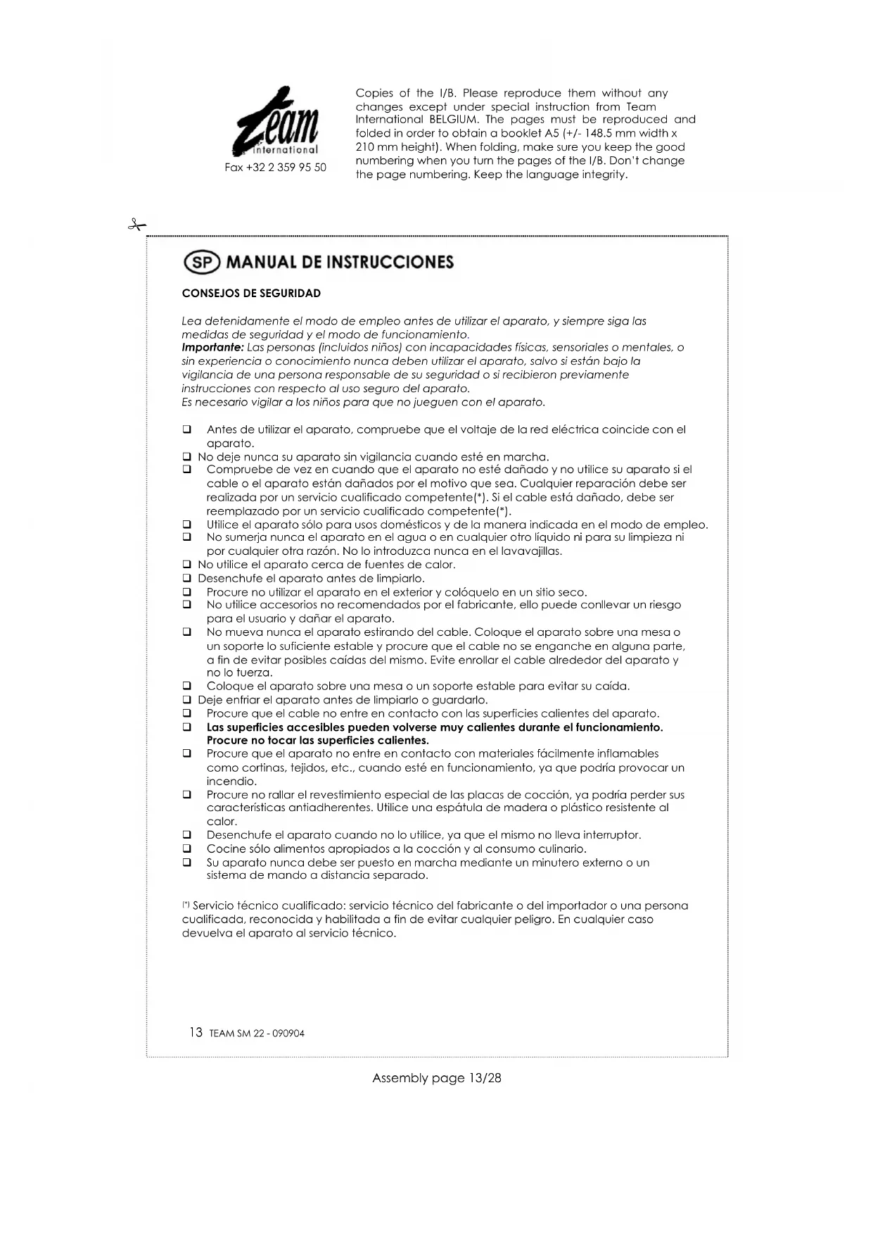 Fax +32 2 359 95 50 PROTECCIÓN DEL MEDIO AMBIENTE – DIRECTIVA 2002/96/CE Para poder preservar nuestro medio ambiente y proteger la salud humana, los residuos eléctricos y equipos electrónicos deberían ser destruidos de acuerdo con unas normas especificas con la implicación de ambos proveedores y consumidores. Por esta razón, como indica el símbolo en la placa de datos técnicos, su aparato no debería ser tirado en un contenedor municipal sino que debería ser devuelto a la tienda, o dejado en un punto de recolección para ser reciclado o usado para otras aplicaciones conforme a la directiva. Copies of the I/B. Please reproduce them without any changes except under special instruction from Team International BELGIUM. The pages must be reproduced and folded in order to obtain a booklet A5 (+/- 148.5 mm width x 210 mm height). When folding, make sure you keep the good numbering when you turn the pages of the I/B. Don’t change the page numbering. Keep the language integrity.