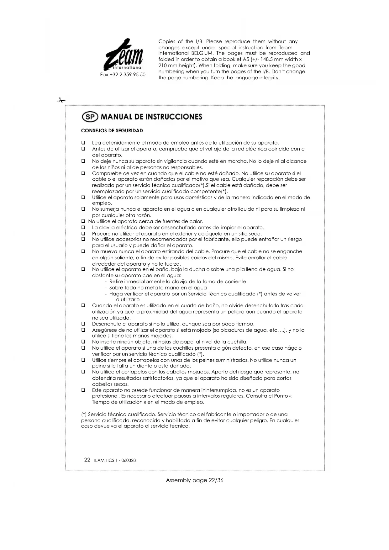 Lea detenidamente el modo de empleo antes de la utilización de su aparato. Antes de utilizar el aparato, compruebe que el voltaje de la red eléctrica coincide con el del aparato. No deje nunca su aparato sin vigilancia cuando esté en marcha. No lo deje ni al alcance de los niños ni al de personas no responsables. Compruebe de vez en cuando que el cable no esté dañado. No utilice su aparato sí el cable o el aparato están dañados por el motivo que sea. Cualquier reparación debe ser realizada por un servicio técnico cualificado(*).Si el cable está dañado, debe ser reemplazado por un servicio cualificado competente(*). Utilice el aparato solamente para usos domésticos y de la manera indicada en el modo de empleo. No sumerja nunca el aparato en el agua o en cualquier otro líquido ni para su limpieza ni por cualquier otra razón. No utilice el aparato cerca de fuentes de calor. La clavija eléctrica debe ser desenchufada antes de limpiar el aparato. Procure no utilizar el aparato en el exterior y colóquelo en un sitio seco. No utilice accesorios no recomendados por el fabricante, ello puede entrañar un riesgo para el usuario y puede dañar el aparato. No mueva nunca el aparato estirando del cable. Procure que el cable no se enganche en algún saliente, a fin de evitar posibles caídas del mismo. Evite enrollar el cable alrededor del aparato y no lo tuerza. No utilice el aparato en el baño, bajo la ducha o sobre una pila llena de agua. Si no obstante su aparato cae en el agua: - Retire inmediatamente la clavija de la toma de corriente - Sobre todo no meta la mano en el agua - Haga verificar el aparato por un Servicio Técnico cualificado (*) antes de volver a utilizarlo Cuando el aparato es utilizado en el cuarto de baño, no olvide desenchufarlo tras cada utilización ya que la proximidad del agua representa un peligro aun cuando el aparato no sea utilizado. Desenchufe el aparato si no lo utiliza, aunque sea por poco tiempo. Asegúrese de no utilizar el aparato si está mojado (salpicaduras de agua, etc. ...), y no lo utilice si tiene las manos mojadas. No inserte ningún objeto, ni hojas de papel al nivel de la cuchilla. No utilice el aparato si una de las cuchillas presenta algún defecto, en ese caso hágalo verificar por un servicio técnico cualificado (*). Utilice siempre el cortapelos con unos de los peines suministrados. No utilice nunca un peine si le falta un diente o está dañado. No utilice el cortapelos con los cabellos mojados. Aparte del riesgo que representa, no obtendría resultados satisfactorios, ya que el aparato ha sido diseñado para cortas cabellos secos. Este aparato no puede funcionar de manera ininterrumpida, no es un aparato profesional. Es necesario efectuar pausas a intervalos regulares. Consulta el Punto « Tiempo de utilización » en el modo de empleo. (*) Servicio técnico cualificado. Servicio técnico del fabricante o importador o de una persona cualificada, reconocida y habilitada a fin de evitar cualquier peligro. En cualquier caso devuelva el aparato al servicio técnico. Copies of the I/B. Please reproduce them without any changes except under special instruction from Team International BELGIUM. The pages must be reproduced and folded in order to obtain a booklet A5 (+/- 148.5 mm width x 210 mm height). When folding, make sure you keep the good numbering when you turn the pages of the I/B. Don’t change the page numbering. Keep the language integrity.