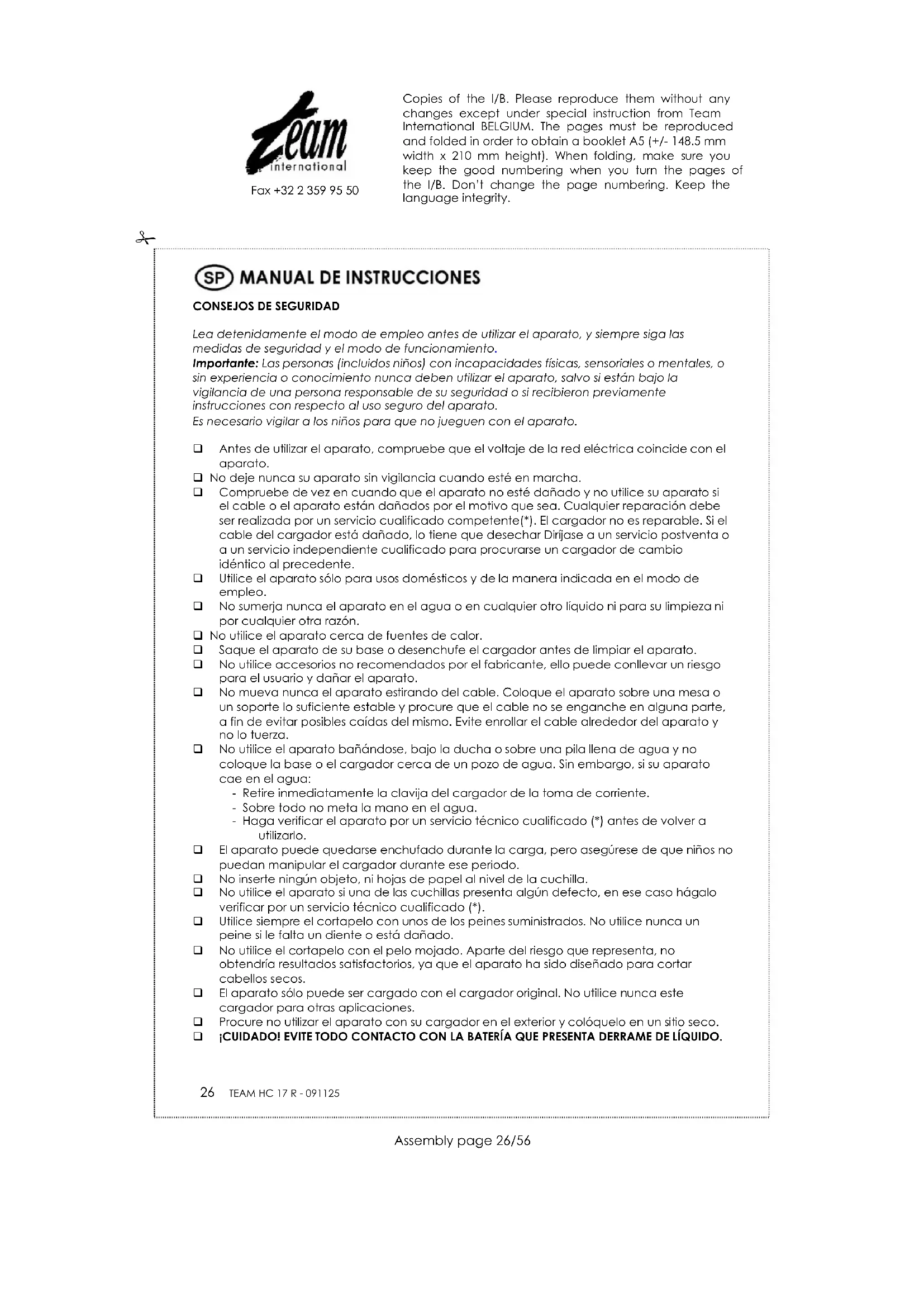 Lea detenidamente el modo de empleo antes de utilizar el aparato, y siempre siga las medidas de seguridad y el modo de funcionamiento. Importante: Las personas (incluidos niños) con incapacidades físicas, sensoriales o mentales, o sin experiencia o conocimiento nunca deben utilizar el aparato, salvo si están bajo la vigilancia de una persona responsable de su seguridad o si recibieron previamente instrucciones con respecto al uso seguro del aparato. Es necesario vigilar a los niños para que no jueguen con el aparato. Antes de utilizar el aparato, compruebe que el voltaje de la red eléctrica coincide con el aparato. No deje nunca su aparato sin vigilancia cuando esté en marcha. Compruebe de vez en cuando que el aparato no esté dañado y no utilice su aparato si el cable o el aparato están dañados por el motivo que sea. Cualquier reparación debe ser realizada por un servicio cualificado competente(*). El cargador no es reparable. Si el cable del cargador está dañado, lo tiene que desechar Diríjase a un servicio postventa o a un servicio independiente cualificado para procurarse un cargador de cambio idéntico al precedente. Utilice el aparato sólo para usos domésticos y de la manera indicada en el modo de empleo. No sumerja nunca el aparato en el agua o en cualquier otro líquido ni para su limpieza ni por cualquier otra razón. No utilice el aparato cerca de fuentes de calor. Saque el aparato de su base o desenchufe el cargador antes de limpiar el aparato. No utilice accesorios no recomendados por el fabricante, ello puede conllevar un riesgo para el usuario y dañar el aparato. No mueva nunca el aparato estirando del cable. Coloque el aparato sobre una mesa o un soporte lo suficiente estable y procure que el cable no se enganche en alguna parte, a fin de evitar posibles caídas del mismo. Evite enrollar el cable alrededor del aparato y no lo tuerza. No utilice el aparato bañándose, bajo la ducha o sobre una pila llena de agua y no coloque la base o el cargador cerca de un pozo de agua. Sin embargo, si su aparato cae en el agua: - Retire inmediatamente la clavija del cargador de la toma de corriente. - Sobre todo no meta la mano en el agua. - Haga verificar el aparato por un servicio técnico cualificado (*) antes de volver a utilizarlo. El aparato puede quedarse enchufado durante la carga, pero asegúrese de que niños no puedan manipular el cargador durante ese periodo. No inserte ningún objeto, ni hojas de papel al nivel de la cuchilla. No utilice el aparato si una de las cuchillas presenta algún defecto, en ese caso hágalo verificar por un servicio técnico cualificado (*). Utilice siempre el cortapelo con unos de los peines suministrados. No utilice nunca un peine si le falta un diente o está dañado. No utilice el cortapelo con el pelo mojado. Aparte del riesgo que representa, no obtendría resultados satisfactorios, ya que el aparato ha sido diseñado para cortar cabellos secos. El aparato sólo puede ser cargado con el cargador original. No utilice nunca este cargador para otras aplicaciones. Procure no utilizar el aparato con su cargador en el exterior y colóquelo en un sitio seco. ¡CUIDADO! EVITE TODO CONTACTO CON LA BATERÍA QUE PRESENTA DERRAME DE LÍQUIDO. Copies of the I/B. Please reproduce them without any changes except under special instruction from Team International BELGIUM. The pages must be reproduced and folded in order to obtain a booklet A5 (+/- 148.5 mm width x 210 mm height). When folding, make sure you keep the good numbering when you turn the pages of the I/B. Don’t change the page numbering. Keep the language integrity.