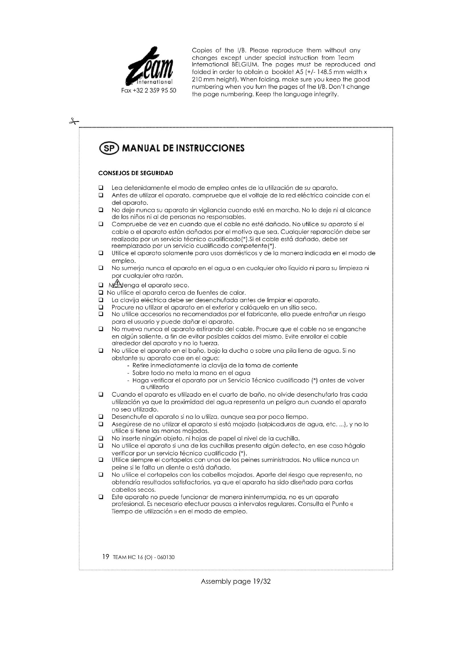 Lea detenidamente el modo de empleo antes de la utilización de su aparato. Antes de utilizar el aparato, compruebe que el voltaje de la red eléctrica coincide con el del aparato. No deje nunca su aparato sin vigilancia cuando esté en marcha. No lo deje ni al alcance de los niños ni al de personas no responsables. Compruebe de vez en cuando que el cable no esté dañado. No utilice su aparato sí el cable o el aparato están dañados por el motivo que sea. Cualquier reparación debe ser realizada por un servicio técnico cualificado(*).Si el cable está dañado, debe ser reemplazado por un servicio cualificado competente(*). Utilice el aparato solamente para usos domésticos y de la manera indicada en el modo de empleo. No sumerja nunca el aparato en el agua o en cualquier otro líquido ni para su limpieza ni por cualquier otra razón. Mantenga el aparato seco. No utilice el aparato cerca de fuentes de calor. La clavija eléctrica debe ser desenchufada antes de limpiar el aparato. Procure no utilizar el aparato en el exterior y colóquelo en un sitio seco. No utilice accesorios no recomendados por el fabricante, ello puede entrañar un riesgo para el usuario y puede dañar el aparato. No mueva nunca el aparato estirando del cable. Procure que el cable no se enganche en algún saliente, a fin de evitar posibles caídas del mismo. Evite enrollar el cable alrededor del aparato y no lo tuerza. No utilice el aparato en el baño, bajo la ducha o sobre una pila llena de agua. Si no obstante su aparato cae en el agua: - Retire inmediatamente la clavija de la toma de corriente - Sobre todo no meta la mano en el agua - Haga verificar el aparato por un Servicio Técnico cualificado (*) antes de volver a utilizarlo Cuando el aparato es utilizado en el cuarto de baño, no olvide desenchufarlo tras cada utilización ya que la proximidad del agua representa un peligro aun cuando el aparato no sea utilizado. Desenchufe el aparato si no lo utiliza, aunque sea por poco tiempo. Asegúrese de no utilizar el aparato si está mojado (salpicaduras de agua, etc. ...), y no lo utilice si tiene las manos mojadas. No inserte ningún objeto, ni hojas de papel al nivel de la cuchilla. No utilice el aparato si una de las cuchillas presenta algún defecto, en ese caso hágalo verificar por un servicio técnico cualificado (*). Utilice siempre el cortapelos con unos de los peines suministrados. No utilice nunca un peine si le falta un diente o está dañado. No utilice el cortapelos con los cabellos mojados. Aparte del riesgo que representa, no obtendría resultados satisfactorios, ya que el aparato ha sido diseñado para cortas cabellos secos. Este aparato no puede funcionar de manera ininterrumpida, no es un aparato profesional. Es necesario efectuar pausas a intervalos regulares. Consulta el Punto « Tiempo de utilización » en el modo de empleo. Copies of the I/B. Please reproduce them without any changes except under special instruction from Team International BELGIUM. The pages must be reproduced and folded in order to obtain a booklet A5 (+/- 148.5 mm width x 210 mm height). When folding, make sure you keep the good numbering when you turn the pages of the I/B. Don’t change the page numbering. Keep the language integrity.