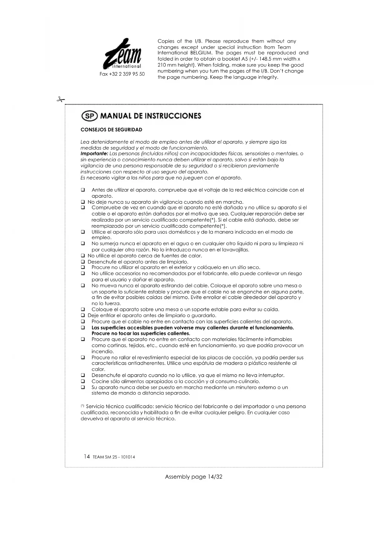 PROTECCIÓN DEL MEDIO AMBIENTE – DIRECTIVA 2002/96/CE Para poder preservar nuestro medio ambiente y proteger la salud humana, los residuos eléctricos y equipos electrónicos deberían ser destruidos de acuerdo con unas normas especificas con la implicación de ambos proveedores y consumidores. Por esta razón, como indica el símbolo en la placa de datos técnicos, su aparato no debería ser tirado en un contenedor municipal sino que debería ser devuelto a la tienda, o dejado en un punto de recolección para ser reciclado o usado para otras aplicaciones conforme a la directiva. Copies of the I/B. Please reproduce them without any changes except under special instruction from Team International BELGIUM. The pages must be reproduced and folded in order to obtain a booklet A5 (+/- 148.5 mm width x 210 mm height). When folding, make sure you keep the good numbering when you turn the pages of the I/B. Don’t change the page numbering. Keep the language integrity.