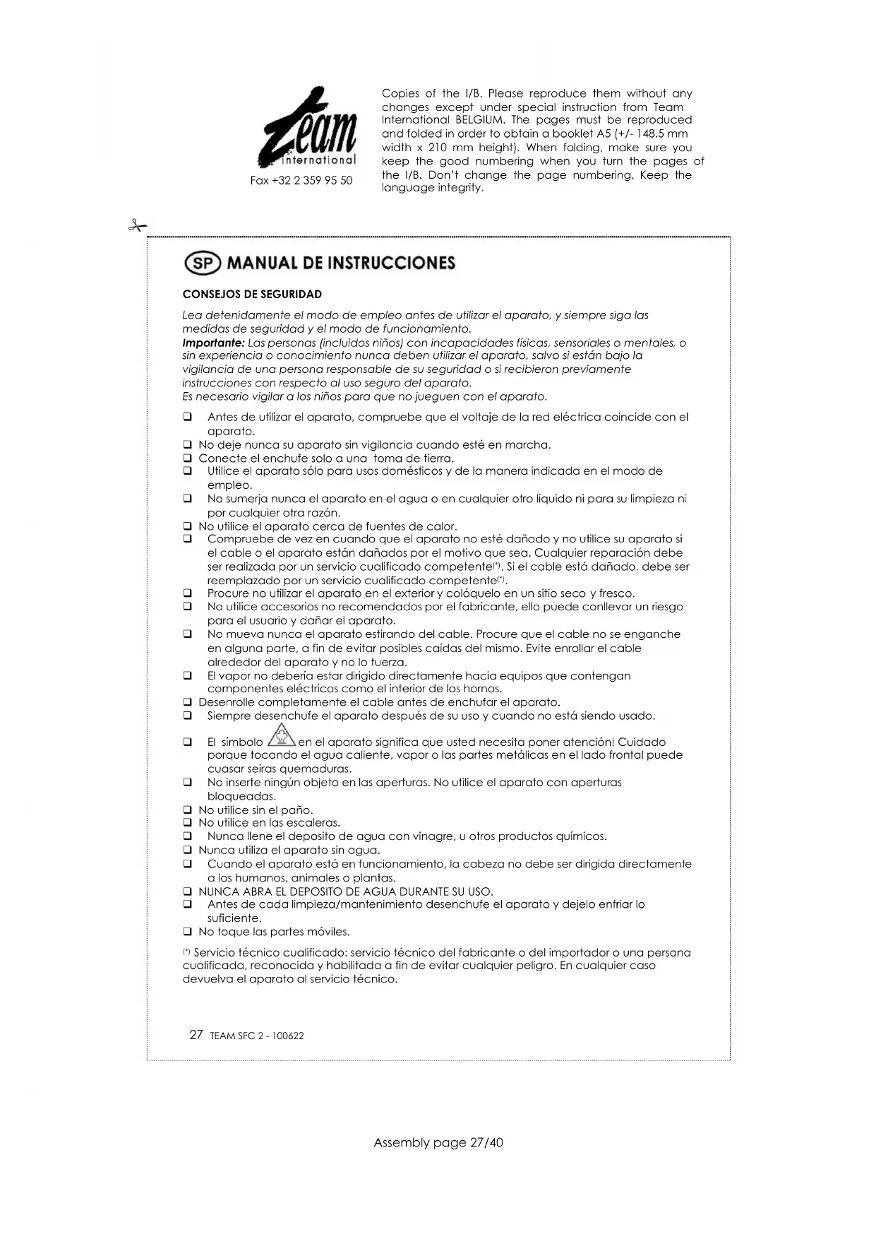 PROTECCIÓN DEL MEDIO AMBIENTE – DIRECTIVA 2002/96/CE Para poder preservar nuestro medio ambiente y proteger la salud humana, los residuos eléctricos y equipos electrónicos deberían ser destruidos de acuerdo con unas normas especificas con la implicación de ambos proveedores y consumidores. Por esta razón, como indica el símbolo en la placa de datos técnicos, su aparato no debería ser tirado en un contenedor municipal sino que debería ser devuelto a la tienda, o dejado en un punto de recolección para ser reciclado o usado para otras aplicaciones conforme a la directiva. Copies of the I/B. Please reproduce them without any changes except under special instruction from Team International BELGIUM. The pages must be reproduced and folded in order to obtain a booklet A5 (+/- 148.5 mm width x 210 mm height). When folding, make sure you keep the good numbering when you turn the pages of the I/B. Don’t change the page numbering. Keep the language integrity.