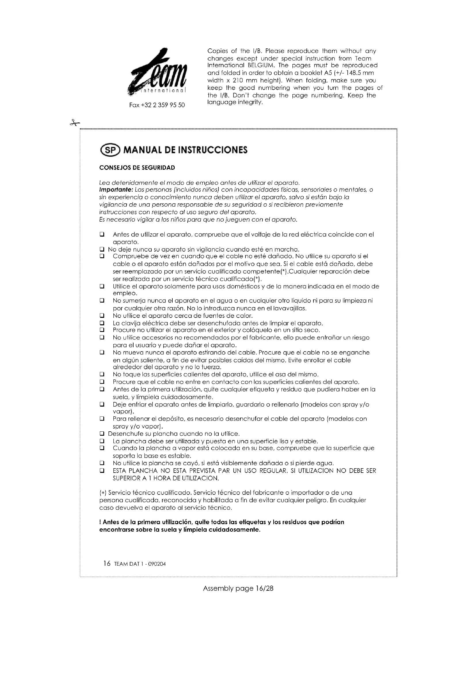 Coloque el botón del termostato en la posición "MIN" y desenchufe la plancha de la toma de corriente. Vacíe el depósito de agua. Coloque la plancha en posición vertical y déjela enfriar, así la humedad se evaporará. Cuando la suela se haya enfriado, usted puede guardar la plancha. PROTECCIÓN DEL MEDIO AMBIENTE –DIRECTIVA 2002/96/CE Para poder preservar nuestro medio ambiente y proteger la salud humana, los residuos eléctricos y equipos electrónicos deberían ser destruidos de acuerdo con unas normas especificas con la implicación de ambos proveedores y consumidores. Por esta razón, como indica el símbolo en la placa de datos técnicos, su aparato no debería ser tirado en un contenedor municipal sino que debería ser devuelto a la tienda, o dejado en un punto de recolección para ser reciclado o usado para otras aplicaciones conforme a la directiva. Copies of the I/B. Please reproduce them without any changes except under special instruction from Team International BELGIUM. The pages must be reproduced and folded in order to obtain a booklet A5 (+/- 148.5 mm width x 210 mm height). When folding, make sure you keep the good numbering when you turn the pages of the I/B. Don‟t change the page numbering. Keep the language integrity.