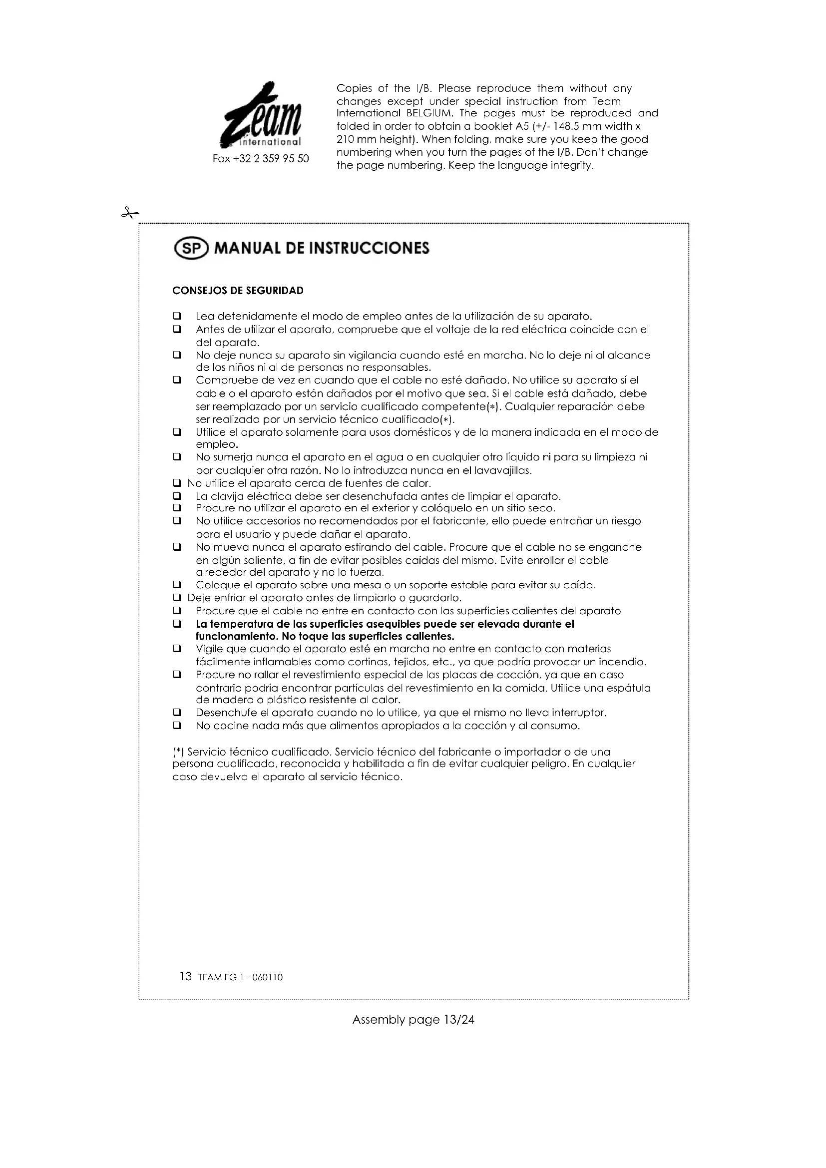 Fax +32 2 359 95 50 PROTECCIÓN DEL MEDIO AMBIENTE –DIRECTIVA 2002/96/CE Para poder preservar nuestro medio ambiente y proteger la salud humana, los residuos eléctricos y equipos electrónicos deberían ser destruidos de acuerdo con unas normas especificas con la implicación de ambos proveedores y consumidores. Por esta razón, como indica el símbolo en la placa de datos técnicos, su aparato debería no ser destruido en un contenedor municipal sino que debería ser devuelto a la tienda, o dejarlo en un punto de recolección para que se pueda reciclar que significa que pueda volver a ser usado, reciclando o para otras aplicaciones. Copies of the I/B. Please reproduce them without any changes except under special instruction from Team International BELGIUM. The pages must be reproduced and folded in order to obtain a booklet A5 (+/- 148.5 mm width x 210 mm height). When folding, make sure you keep the good numbering when you turn the pages of the I/B. Don’t change the page numbering. Keep the language integrity.