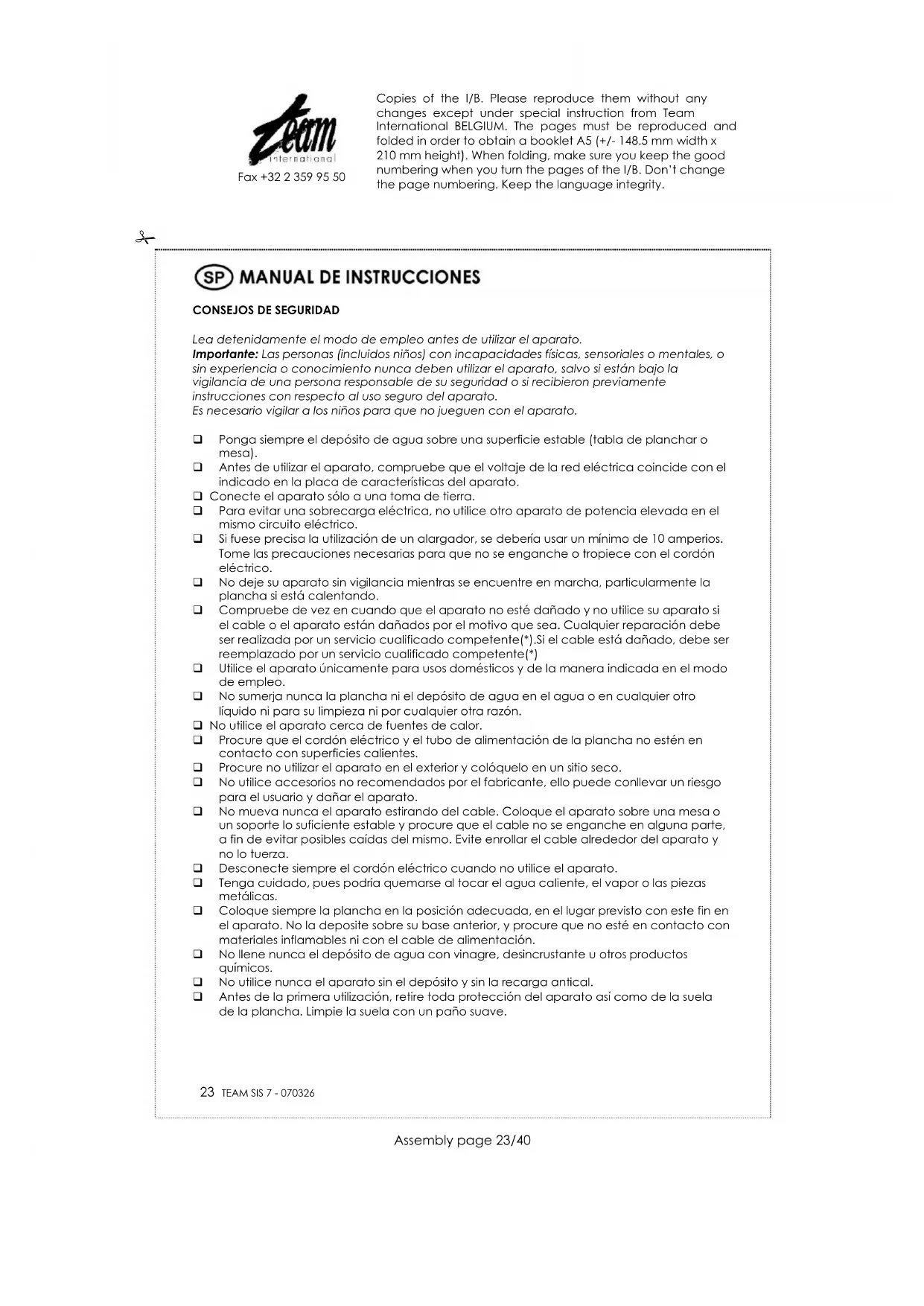 Fax +32 2 359 95 50 RECARGA ANTICAL Su aparato está provisto de una recarga antical situada dentro del tapón (13) del dépósito. Por lo tanto, podrá utilizar agua de grifo ya que la recarga la filtrará. Es necesario reemplazar la recarga aproximadamente cada 6 meses. Sin embargo este período puede variar dependiendo de la frecuencia del uso y del contenido de la cal del agua en su área. Si el agua contiene mucha cal, usted tendrá que reemplazar la recarga con más frecuencia. Para sacar la recarga, quite la tapa del tapón del depósito. Para proporcionarse una nueva recarga, contacte el Servicio Post-Venta más cercano. ¡No utilice nunca el aparato sin recarga antical! LIMPIEZA Los partes de plástico pueden limpiarse con un paño húmedo. Para limpiar la suela de la plancha, utilice cualquier producto que venden en el mercado para este fin y siga sus instrucciones. No introduzca nunca el aparato en agua o en cualquier otro líquido. PROTECCIÓN DEL MEDIO AMBIENTE –DIRECTIVA 2002/96/CE Para poder preservar nuestro medio ambiente y proteger la salud humana, los residuos eléctricos y equipos electrónicos deberían ser destruidos de acuerdo con unas normas especificas con la implicación de ambos proveedores y consumidores. Por esta razón, como indica el símbolo en la placa de datos técnicos, su aparato no debería ser tirado en un contenedor municipal sino que debería ser devuelto a la tienda, o dejado en un punto de recolección para ser reciclado o usado para otras aplicaciones conforme a la directiva. Copies of the I/B. Please reproduce them without any changes except under special instruction from Team International BELGIUM. The pages must be reproduced and folded in order to obtain a booklet A5 (+/- 148.5 mm width x 210 mm height). When folding, make sure you keep the good numbering when you turn the pages of the I/B. Don‟t change the page numbering. Keep the language integrity.