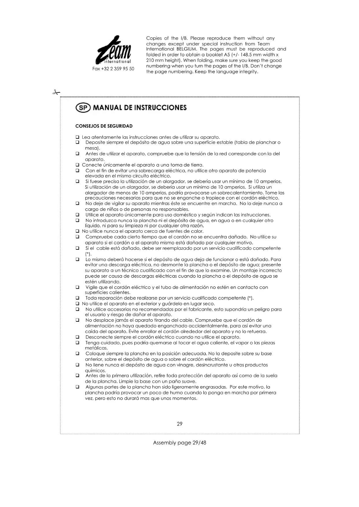 Lo mismo deberá hacerse si el depósito de agua deja de funcionar o está dañado. Para evitar una descarga eléctrica, no desmonte la plancha o el depósito de agua; presente su aparato a un técnico cualificado con el fin de que lo examine. Un montaje incorrecto puede ser causa de descargas eléctricas cuando la plancha o el depósito de agua se estén utilizando. Vigile que el cordón eléctrico y el tubo de alimentación no estén en contacto con superficies calientes. Toda reparación debe realizarse por un servicio cualificado competente (*). No utilice el aparato en el exterior y guárdelo en lugar seco. No utilice accesorios no recomendados por el fabricante, esto supondría un peligro para el usuario y riesgo de dañar el aparato. No desplace jamás el aparato tirando del cable. Compruebe que el cordón de alimentación no haya quedado enganchado accidentalmente, para así evitar una caída del aparato. Evite enrollar el cordón alrededor del aparato y no lo retuerza. Desconecte siempre el cordón eléctrico cuando no utilice el aparato. Tenga cuidado, pues podría quemarse al tocar el agua caliente, el vapor o las piezas metálicas. Coloque siempre la plancha en la posición adecuada. No la deposite sobre su base anterior, sobre el depósito de agua o sobre el cordón eléctrico. No llene nunca el depósito de agua con vinagre, desincrustante u otros productos químicos. Antes de la primera utilización, retire toda protección del aparato así como de la suela de la plancha. Limpie la base con un paño suave. Algunas partes de la plancha han sido ligeramente engrasadas. Por este motivo, la plancha podría provocar un poco de humo cuando lo ponga en marcha por primera vez, pero esto no durará mas que unos momentos. Copies of the I/B. Please reproduce them without any changes except under special instruction from Team International BELGIUM. The pages must be reproduced and folded in order to obtain a booklet A5 (+/- 148.5 mm width x 210 mm height). When folding, make sure you keep the good numbering when you turn the pages of the I/B. Don‟t change the page numbering. Keep the language integrity.