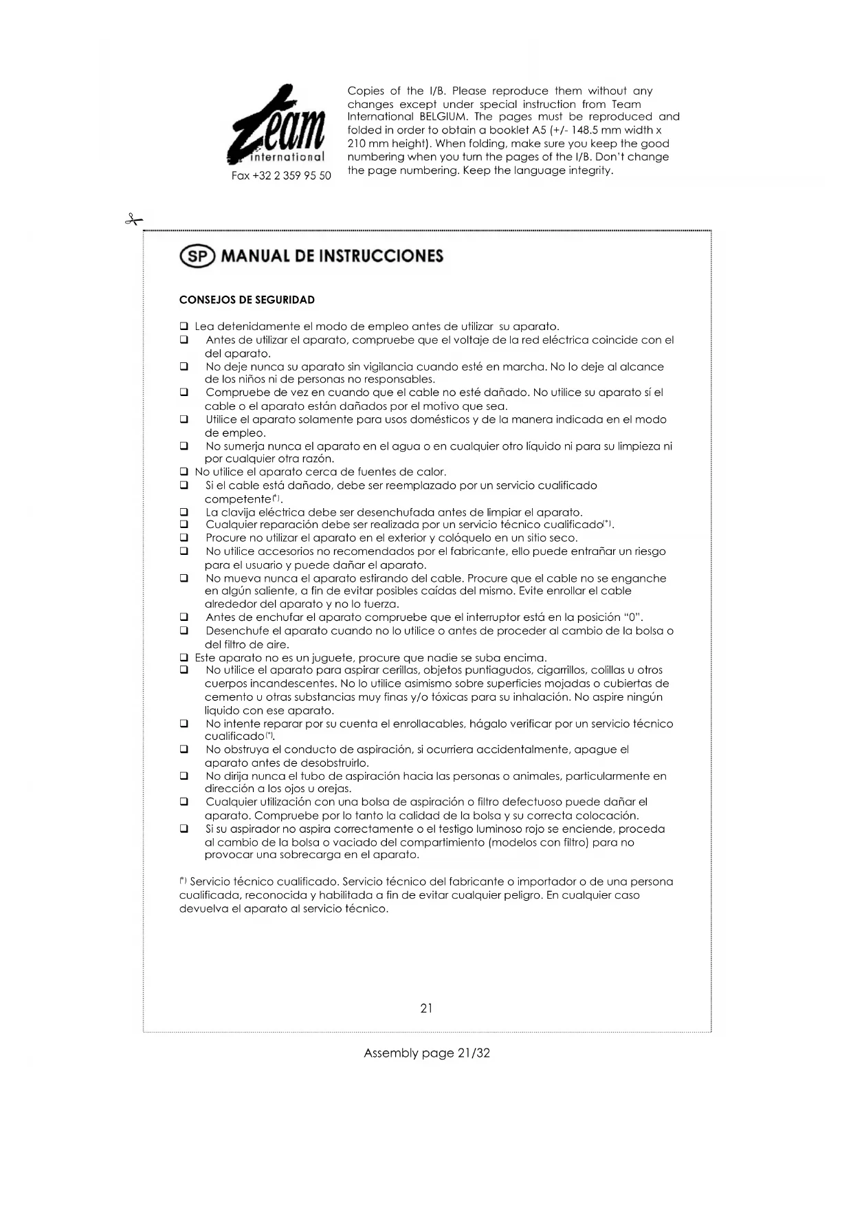 Limpieza de escaleras y escalones: poner el aparato en posición vertical, o bien utilizar la correa en dotación para enganchar el aparato al hombro. Para montarla, fijar los dos mosquetones a los dos agujeros situados detrás del aparato y pasar su anillo alrededor del acoplamiento del tubo flexible antes de enganchar este al compartimiento del polvo. Para ganar sitio y guardar la aspiradora fácilmente, bajo el aparato existe un alojamiento listo para recibir el tubo del cepillo universal. Se puede, pues, poner la aspiradora verticalmente haciendo deslizar el tubo del cepillo en el alojamiento predispuesto. De esta manera, el tubo flexible, los tubos y el cepillo universal estarán enganchados al aparato en posición vertical. También en la parte horizontal detrás del aparato existe un alojamiento que permite apoyar el conjunto de cepillo, tubos y flexible durante la utilización ( para poder desplazar un mueble, por ejemplo). En caso de funcionamiento defectuoso (disminución de potencia, parada completa del aparato), controlar antes que no haya bloqueo en la aspiración a nivel del tubo o del flexible y, si no hay, llevar el aparato a un centro autorizado para un control o una reparación. Copies of the I/B. Please reproduce them without any changes except under special instruction from Team International BELGIUM. The pages must be reproduced and folded in order to obtain a booklet A5 (+/- 148.5 mm width x 210 mm height). When folding, make sure you keep the good numbering when you turn the pages of the I/B. Don’t change the page numbering. Keep the language integrity.