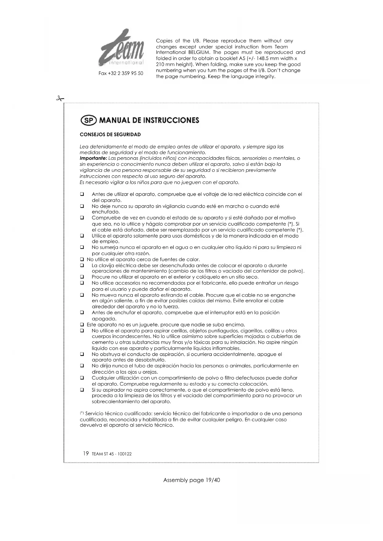 Limpieza de la escalera: ponga su aparato en posición vertical. Para un buen mantenimiento de su aparato, cambie a tiempo el filtro y la bolsa. Si su aspirador no funciona correctamente (potencia baja, ruido anormal, parada repentina, compartimento de polvo lleno), compruebe que el tubo o el flexible no están obstruidos. En cualquier otro caso devuelva el aparato al servicio técnico. PROTECCIÓN DEL MEDIO AMBIENTE – DIRECTIVA 2002/96/CE Para poder preservar nuestro medio ambiente y proteger la salud humana, los residuos eléctricos y equipos electrónicos deberían ser destruidos de acuerdo con unas normas especificas con la implicación de ambos proveedores y consumidores. Por esta razón, como indica el símbolo en la placa de datos técnicos, su aparato no debería ser tirado en un contenedor municipal sino que debería ser devuelto a la tienda, o dejado en un punto de recolección para ser reciclado o usado para otras aplicaciones conforme a la directiva. Copies of the I/B. Please reproduce them without any changes except under special instruction from Team International BELGIUM. The pages must be reproduced and folded in order to obtain a booklet A5 (+/- 148.5 mm width x 210 mm height). When folding, make sure you keep the good numbering when you turn the pages of the I/B. Don‟t change the page numbering. Keep the language integrity.