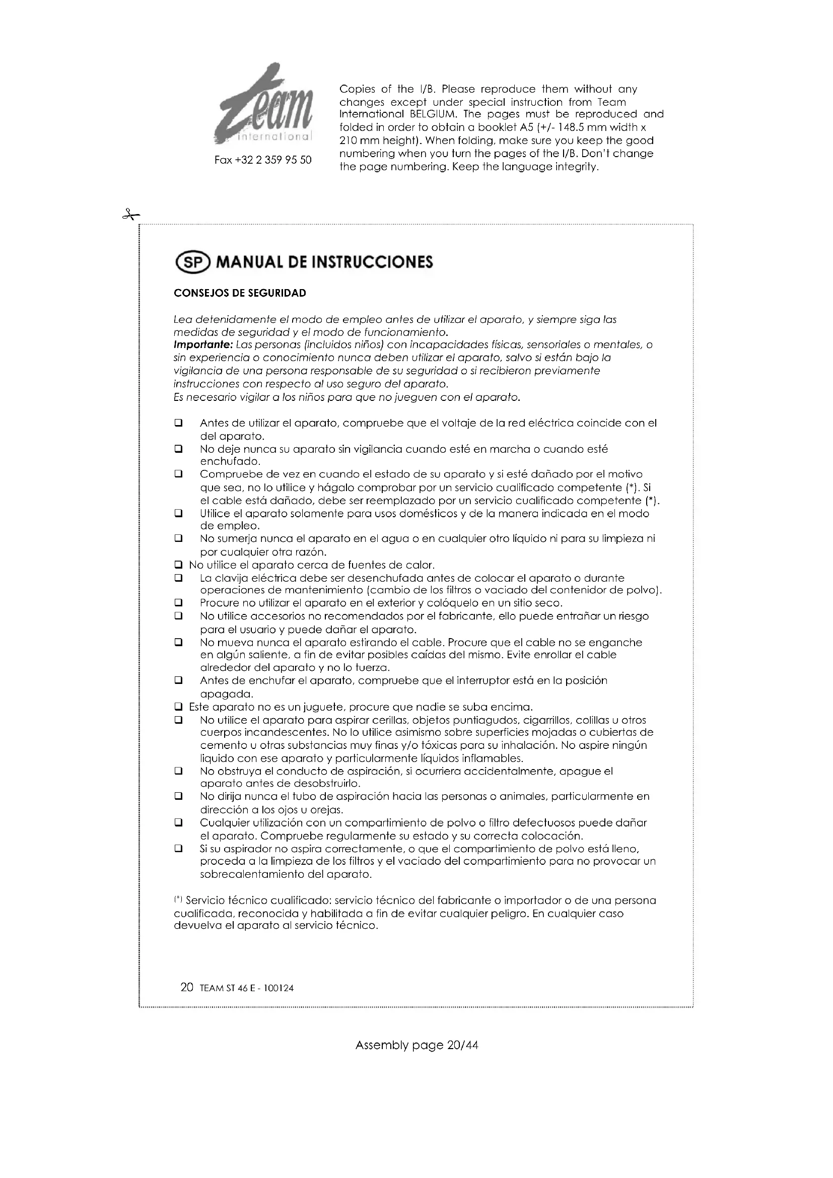 Limpieza de la escalera: ponga su aparato en posición vertical. Para recoger el aparato más fácilmente, puede enganchar el gancho del tubo del cepillo universal en la trasera del aparato (el mango del contenedor de polvo). Puede también engancharlo durante el funcionamiento para desplazar un mueble por ejemplo. Para un buen mantenimiento de su aparato, cambie a tiempo el filtro y la bolsa. Si su aspirador no funciona correctamente (potencia baja, ruido anormal, parada repentina, compartimento de polvo lleno), compruebe que el tubo o el flexible no están obstruidos. En cualquier otro caso devuelva el aparato al servicio técnico. PROTECCIÓN DEL MEDIO AMBIENTE – DIRECTIVA 2002/96/CE Para poder preservar nuestro medio ambiente y proteger la salud humana, los residuos eléctricos y equipos electrónicos deberían ser destruidos de acuerdo con unas normas especificas con la implicación de ambos proveedores y consumidores. Por esta razón, como indica el símbolo en la placa de datos técnicos, su aparato no debería ser tirado en un contenedor municipal sino que debería ser devuelto a la tienda, o dejado en un punto de recolección para ser reciclado o usado para otras aplicaciones conforme a la directiva. Copies of the I/B. Please reproduce them without any changes except under special instruction from Team International BELGIUM. The pages must be reproduced and folded in order to obtain a booklet A5 (+/- 148.5 mm width x 210 mm height). When folding, make sure you keep the good numbering when you turn the pages of the I/B. Don‟t change the page numbering. Keep the language integrity.