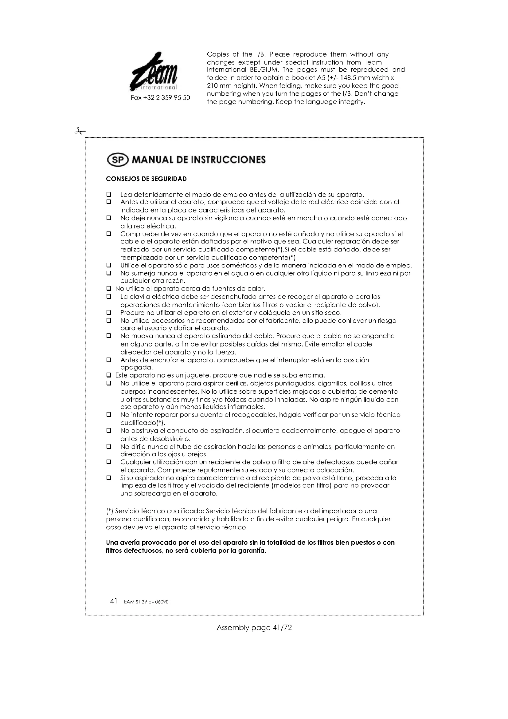 Para poder preservar nuestro medio ambiente y proteger la salud humana, los residuos eléctricos y equipos electrónicos deberían ser destruidos de acuerdo con unas normas especificas con la implicación de ambos proveedores y consumidores. Por esta razón, como indica el símbolo en la placa de datos técnicos, su aparato no debería ser tirado en un contenedor municipal sino que debería ser devuelto a la tienda, o dejado en un punto de recolección para ser reciclado o usado para otras aplicaciones conforme a la directiva. Copies of the I/B. Please reproduce them without any changes except under special instruction from Team International BELGIUM. The pages must be reproduced and folded in order to obtain a booklet A5 (+/- 148.5 mm width x 210 mm height). When folding, make sure you keep the good numbering when you turn the pages of the I/B. Don’t change the page numbering. Keep the language integrity.