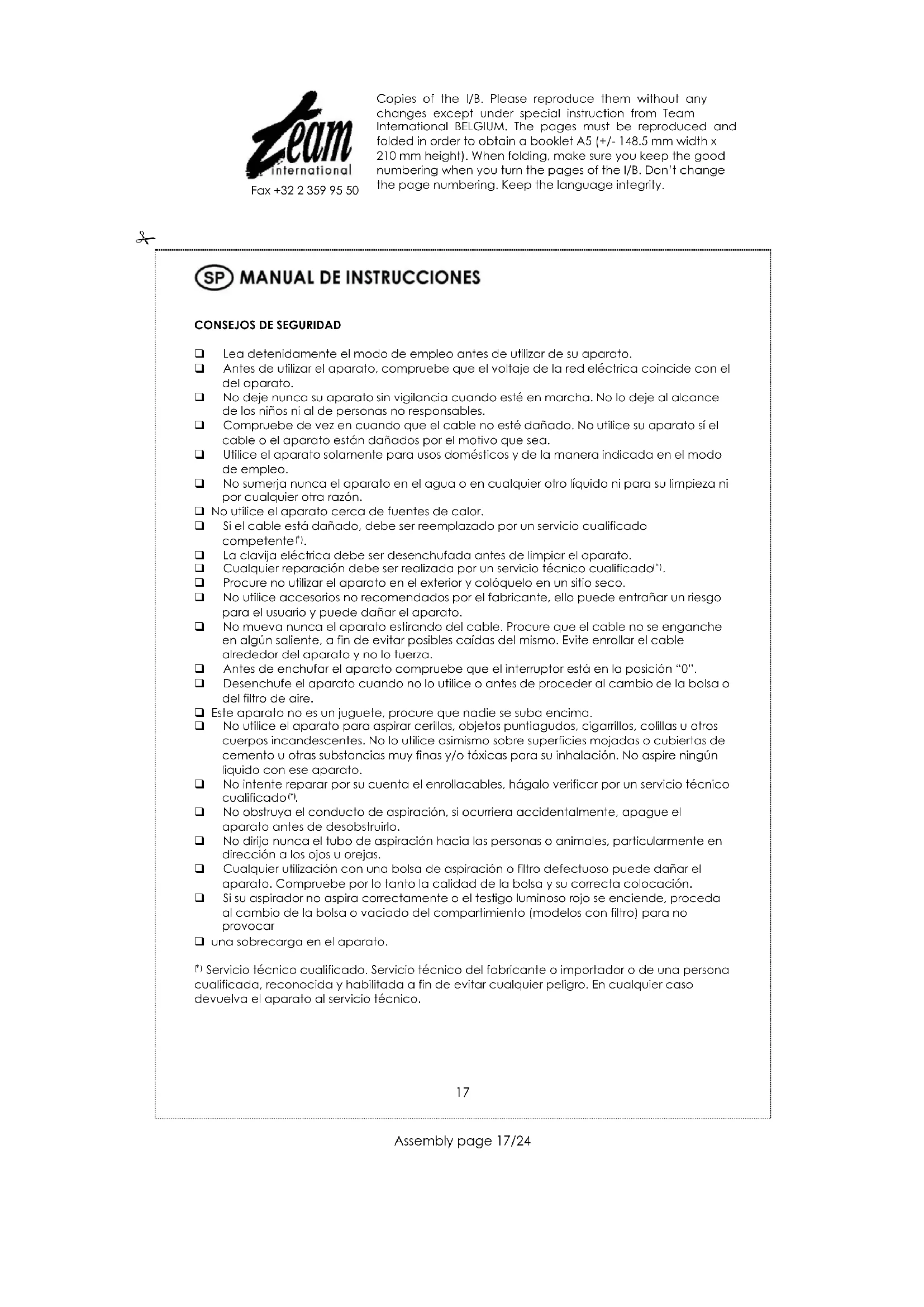 Pare el aparato presionando el pedal de ON/OFF. Desconecte el aspirador. Presione sobre el asa para activar el recogecables automático (Fig. 5). EMPLAZAMIENTO DE LA BOLSA Y SISTEMAS DE FILTRADO El sistema de filtración contiene: Un filtro protector del motor Un microfiltro para retener las partículas de polvo Es necesario cambiar los filtros de manera regular a fin de evitar fallos de funcionamiento. Bolsa de residuos Cuando la bolsa de residuos esta llena, la potencia de su aspirador disminuye, esto indica que debe cambiar la bolsa. Compruebe que su aparato no este bloqueado por un objeto grande, esto también provocaría que la potencia disminuyese fuertemente, en este caso no reemplace la bolsa, quite el objeto que lo bloquea. Desconectar el aparato de la red, y reemplace la bolsa. Abra la tapa del aparato (Fig. 6). Tire de la palanca o botón hacia el orificio de conexión del tubo (Fig7) y quite la bolsa tirando suavemente hacia el interior. Para renovar la bolsa actúe en sentido inverso. Copies of the I/B. Please reproduce them without any changes except under special instruction from Team International BELGIUM. The pages must be reproduced and folded in order to obtain a booklet A5 (+/- 148.5 mm width x 210 mm height). When folding, make sure you keep the good numbering when you turn the pages of the I/B. Don‟t change the page numbering. Keep the language integrity.