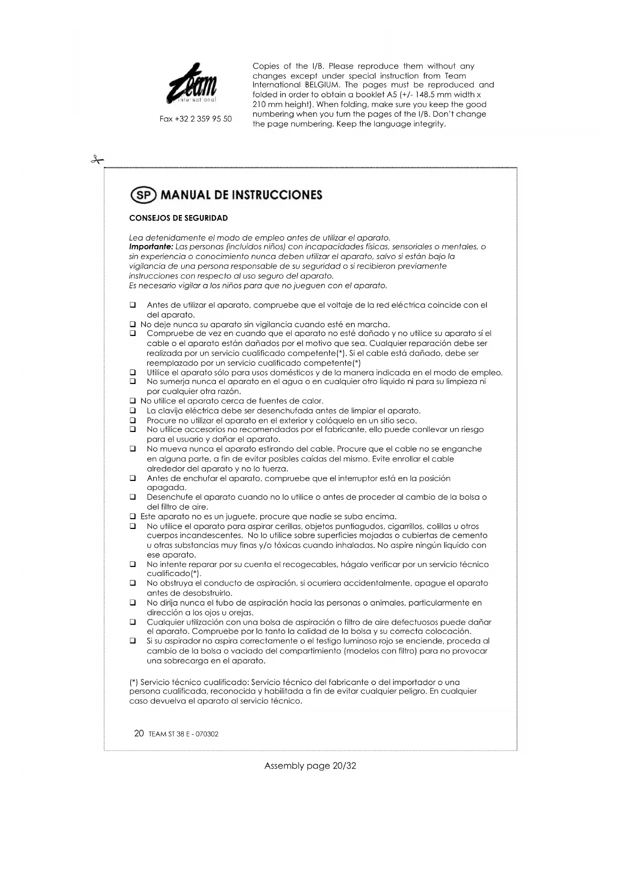 Para poder preservar nuestro medio ambiente y proteger la salud humana, los residuos eléctricos y equipos electrónicos deberían ser destruidos de acuerdo con unas normas especificas con la implicación de ambos proveedores y consumidores. Por esta razón, como indica el símbolo ; en la placa de datos técnicos, su aparato no debería ser tirado en un contenedor municipal sino que debería ser devuelto a la tienda, o dejado en un punto de recolección para ser reciclado o usado para otras aplicaciones conforme a la directiva. Copies of the I/B. Please reproduce them without any changes except under special instruction from Team International BELGIUM. The pages must be reproduced and folded in order to obtain a booklet A5 (+/- 148.5 mm width x 210 mm height). When folding, make sure you keep the good numbering when you turn the pages of the I/B. Don’t change the page numbering. Keep the language integrity.