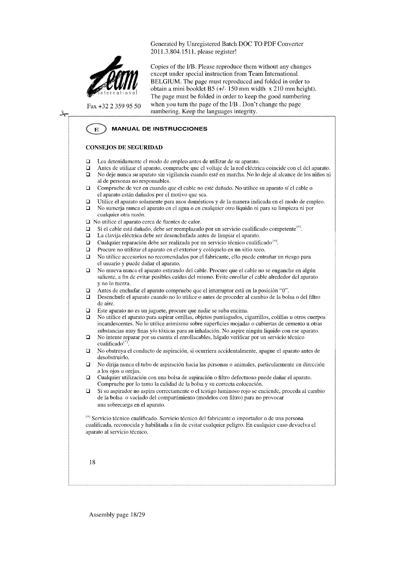 Pare el aparato presionando el pedal de OFF/ON. Desconecte el aspirador. Presione el pedal recogecables para enrollarlo automáticamente. EMPLAZAMIENTO DE LA BOLSA Y SISTEMAS DE FILTRADO El sistema de filtración contiene: Un filtro protector del motor Un microfiltro para retener las partículas de polvo Es necesario cambiar los filtros de manera regular a fin de evitar fallos de funcionamiento. Bolsa de residuos Cuando la bolsa de residuos esta llena, la potencia de su aspirador disminuye, esto indica que debe cambiar la bolsa. Compruebe que su aparato no este bloqueado por un objeto grande, esto también provocaría que la potencia disminuyese fuertemente, en este caso no reemplace la bolsa, quite el objeto que lo bloquea. Desconectar el aparato de la red, y reemplace la bolsa. Abra la tapa del compartimiento de residuos. Saque la bolsa del soporte y tírela sin plegarla.Generated by Unregistered Batch DOC TO PDF Converter 2011.3.804.1511, please register! Copies of the I/B. Please reproduce them without any changes except under special instruction from Team International BELGIUM. The page must reproduced and folded in order to obtain a mini booklet B5 (+/- 150 mm width x 210 mm height). The page must be folded in order to keep the good numbering when you turn the page of the I/B . Don‟t change the page numbering. Keep the languages integrity.