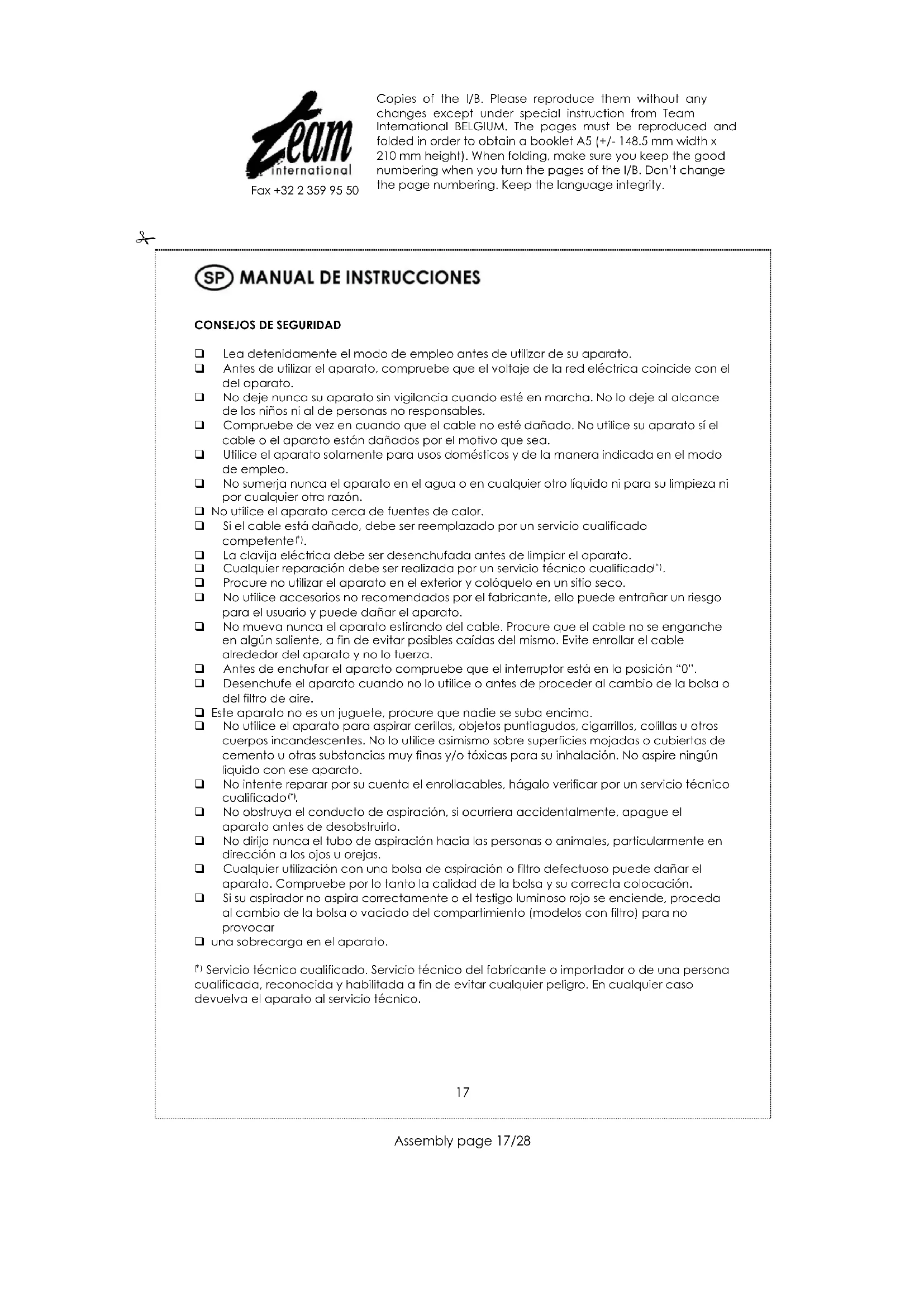 Limpieza de la escalera: ponga su aparato en posición vertical. Para un buen mantenimiento de su aparato, cambie a tiempo el filtro y la bolsa. Hay un hueco para el tubo en la parte de trasera del aparato. Para unir el tubo al aparato, ponga el aparato en posición vertical. Si su aspirador no funciona correctamente (potencia baja, ruido anormal, parada repentina), compruebe que el tubo o el flexible no están obstruidos. En cualquier otro caso devuelva el aparato al servicio técnico. Copies of the I/B. Please reproduce them without any changes except under special instruction from Team International BELGIUM. The pages must be reproduced and folded in order to obtain a booklet A5 (+/- 148.5 mm width x 210 mm height). When folding, make sure you keep the good numbering when you turn the pages of the I/B. Don‟t change the page numbering. Keep the language integrity.