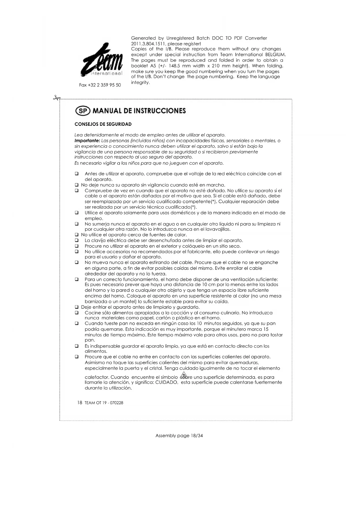 Lea detenidamente el modo de empleo antes de utilizar el aparato. Importante: Las personas (incluidos niños) con incapacidades físicas, sensoriales o mentales, o sin experiencia o conocimiento nunca deben utilizar el aparato, salvo si están bajo la vigilancia de una persona responsable de su seguridad o si recibieron previamente instrucciones con respecto al uso seguro del aparato. Es necesario vigilar a los niños para que no jueguen con el aparato. Antes de utilizar el aparato, compruebe que el voltaje de la red eléctrica coincide con el del aparato. No deje nunca su aparato sin vigilancia cuando esté en marcha. Compruebe de vez en cuando que el aparato no esté dañado. No utilice su aparato sí el cable o el aparato están dañados por el motivo que sea. Si el cable está dañado, debe ser reemplazado por un servicio cualificado competente(*). Cualquier reparación debe ser realizada por un servicio técnico cualificado(*). Utilice el aparato solamente para usos domésticos y de la manera indicada en el modo de empleo. No sumerja nunca el aparato en el agua o en cualquier otro líquido ni para su limpieza ni por cualquier otra razón. No lo introduzca nunca en el lavavajillas. No utilice el aparato cerca de fuentes de calor. La clavija eléctrica debe ser desenchufada antes de limpiar el aparato. Procure no utilizar el aparato en el exterior y colóquelo en un sitio seco. No utilice accesorios no recomendados por el fabricante, ello puede conllevar un riesgo para el usuario y dañar el aparato. No mueva nunca el aparato estirando del cable. Procure que el cable no se enganche en alguna parte, a fin de evitar posibles caídas del mismo. Evite enrollar el cable alrededor del aparato y no lo tuerza. Para un correcto funcionamiento, el horno debe disponer de una ventilación suficiente: Es pues necesario prever que haya una distancia de 10 cm por lo menos entre los lados del horno y la pared o cualquier otro objeto y que tenga un espacio libre suficiente encima del horno. Coloque el aparato en una superficie resistente al calor (no una mesa barnizada o un mantel) lo suficiente estable para evitar su caída. Deje enfriar el aparato antes de limpiarlo y guardarlo. Cocine sólo alimentos apropiados a la cocción y al consumo culinario. No introduzca nunca materiales como papel, cartón o plástico en el horno. Cuando tueste pan no exceda en ningún caso los 10 minutos seguidos, ya que su pan podría quemarse. Esta indicación es muy importante, porque el minutero marca 15 minutos de tiempo máximo. Este tiempo máximo vale para otros usos, pero no para tostar pan. Es indispensable guardar el aparato limpio, ya que está en contacto directo con los alimentos. Procure que el cable no entre en contacto con las superficies calientes del aparato. Asimismo no toque las superficies calientes del mismo para evitar quemaduras, especialmente la puerta y el cristal. Tenga cuidado igualmente de no tocar el elemento calefactor. Cuando encuentre el símbolo sobre una superficie determinada, es para llamarle la atención, y significa: CUIDADO, esta superficie puede calentarse fuertemente durante la utilización.Generated by Unregistered Batch DOC TO PDF Converter 2011.3.804.1511, please register! Copies of the I/B. Please reproduce them without any changes except under special instruction from Team International BELGIUM. The pages must be reproduced and folded in order to obtain a booklet A5 (+/- 148.5 mm width x 210 mm height). When folding, make sure you keep the good numbering when you turn the pages of the I/B. Don’t change the page numbering. Keep the language integrity.