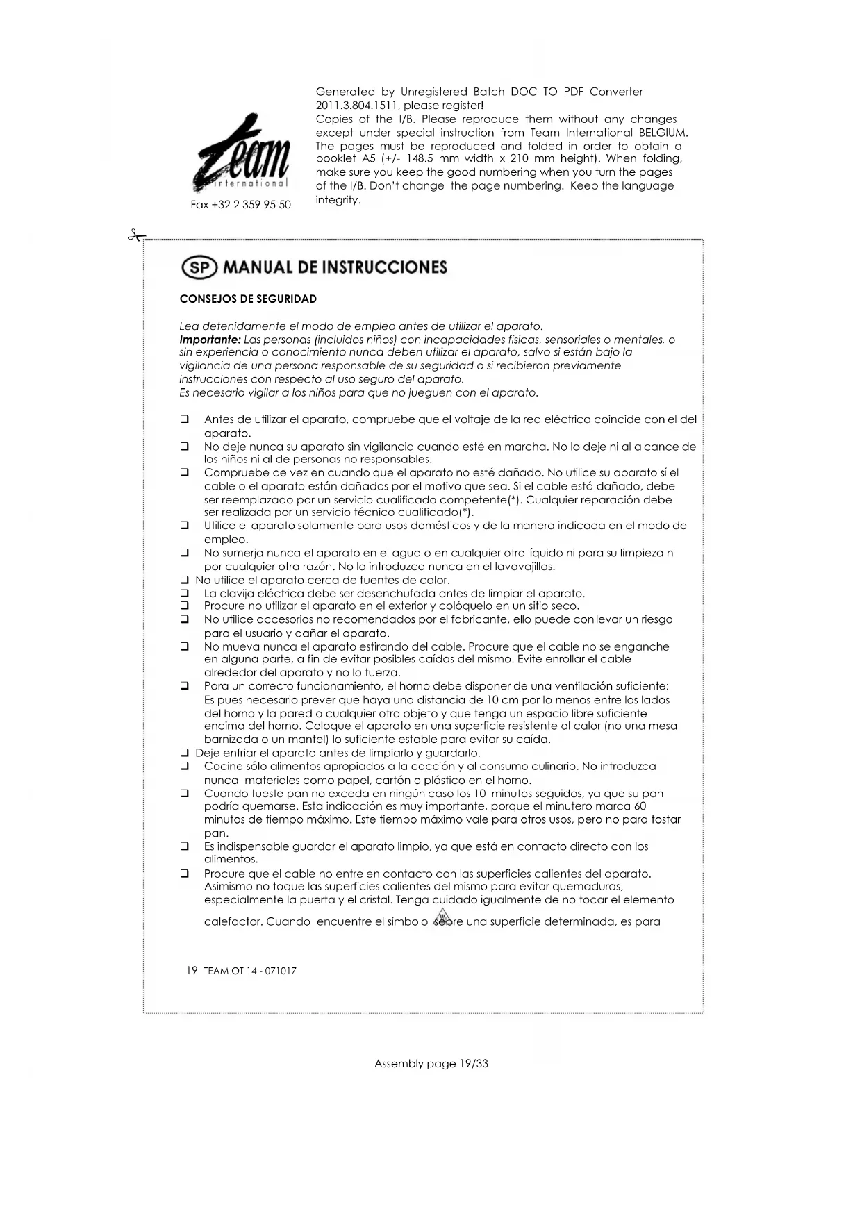 Para poder preservar nuestro medio ambiente y proteger la salud humana, los residuos eléctricos y equipos electrónicos deberían ser destruidos de acuerdo con unas normas especificas con la implicación de ambos proveedores y consumidores. Por esta razón, como indica el símbolo en la placa de datos técnicos, su aparato no debería ser tirado en un contenedor municipal sino que debería ser devuelto a la tienda, o dejado en un punto de recolección para ser reciclado o usado para otras aplicaciones conforme a la directiva.Generated by Unregistered Batch DOC TO PDF Converter 2011.3.804.1511, please register! Copies of the I/B. Please reproduce them without any changes except under special instruction from Team International BELGIUM. The pages must be reproduced and folded in order to obtain a booklet A5 (+/- 148.5 mm width x 210 mm height). When folding, make sure you keep the good numbering when you turn the pages of the I/B. Don’t change the page numbering. Keep the language integrity.