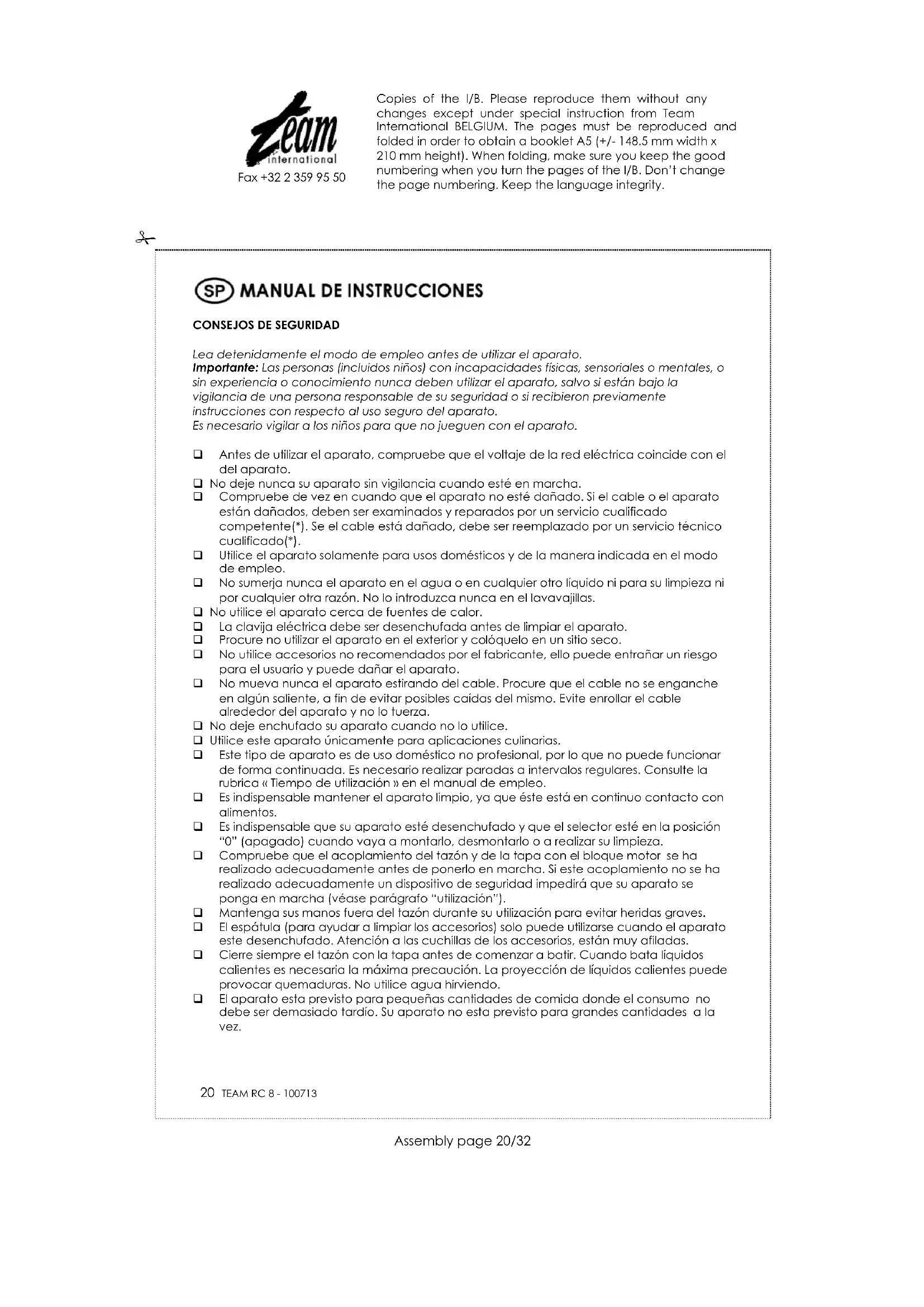 LIMPIEZA Desenchufe el aparato. Gire la tapa con el tubo de llenado en el sentido contrario de las agujas del reloj para soltarlo. Quite los accesorios y el tazón teniendo cuidado de no herirse con las cuchillas. Pase el tazón y los accesorios por agua y déjelos secar. Si necesario, utilice una esponja teniendo cuidado de no herirse con las cuchillas. El bloque motor sólo puede limpiarse con un paño ligeramente humedecido. IMPORTANTE: ¡ No pase nunca el bloque motor por agua. No lo ponga nunca en el lavavajillas. Límpielo sólo con un paño ligeramente humedecido. ¡ Tenga cuidado con las cuchillas ya que están muy afiladas. PROTECCIÓN DEL MEDIO AMBIENTE – DIRECTIVA 2002/96/CE Para poder preservar nuestro medio ambiente y proteger la salud humana, los residuos eléctricos y equipos electrónicos deberían ser destruidos de acuerdo con unas normas especificas con la implicación de ambos proveedores y consumidores. Por esta razón, como indica el símbolo en la placa de datos técnicos, su aparato no debería ser tirado en un contenedor municipal sino que debería ser devuelto a la tienda, o dejado en un punto de recolección para ser reciclado o usado para otras aplicaciones conforme a la directiva. Copies of the I/B. Please reproduce them without any changes except under special instruction from Team International BELGIUM. The pages must be reproduced and folded in order to obtain a booklet A5 (+/- 148.5 mm width x 210 mm height). When folding, make sure you keep the good numbering when you turn the pages of the I/B. Don’t change the page numbering. Keep the language integrity.