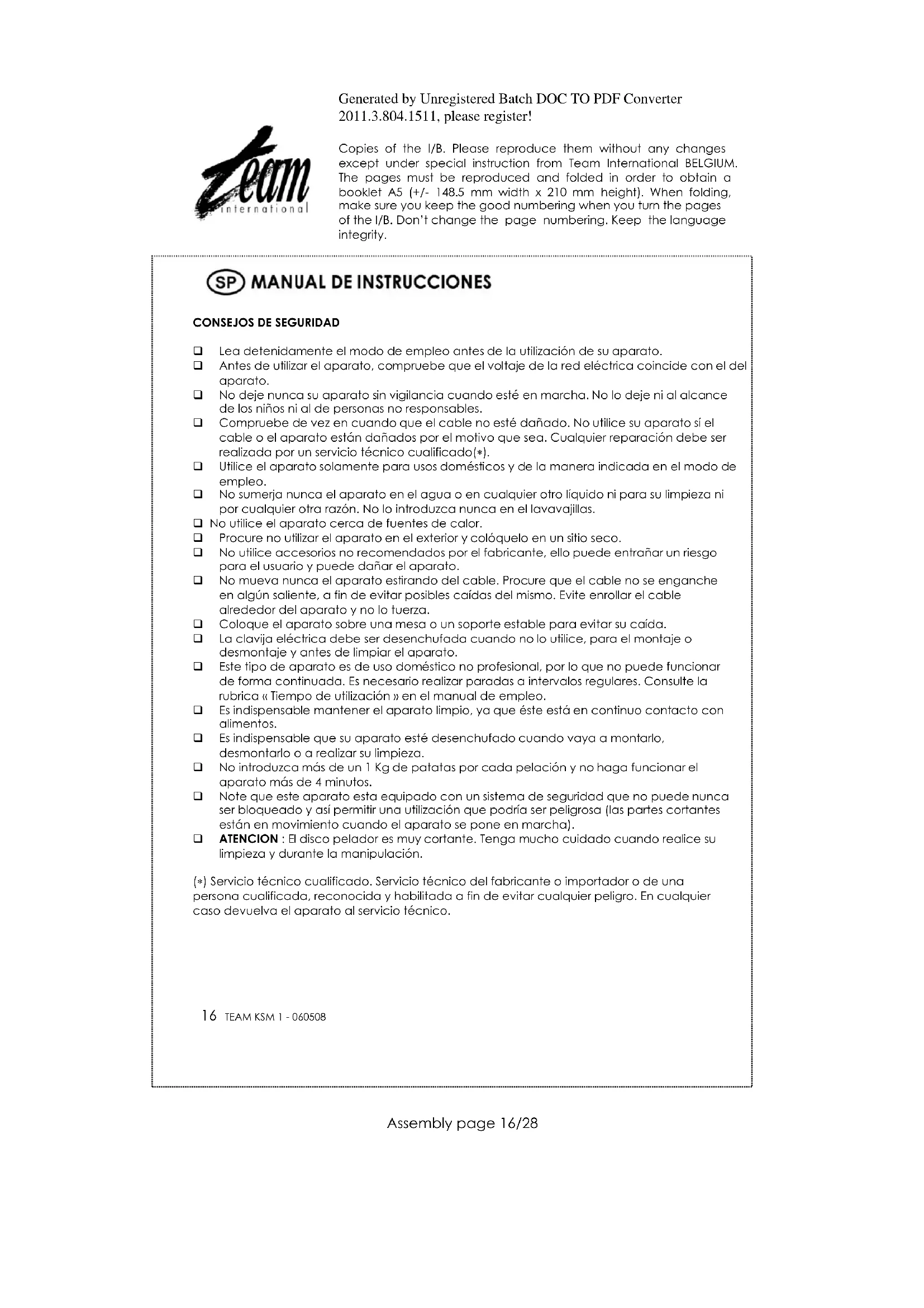 Lea detenidamente el modo de empleo antes de la utilización de su aparato. Antes de utilizar el aparato, compruebe que el voltaje de la red eléctrica coincide con el del aparato. No deje nunca su aparato sin vigilancia cuando esté en marcha. No lo deje ni al alcance de los niños ni al de personas no responsables. Compruebe de vez en cuando que el cable no esté dañado. No utilice su aparato sí el cable o el aparato están dañados por el motivo que sea. Cualquier reparación debe ser realizada por un servicio técnico cualificado(). Utilice el aparato solamente para usos domésticos y de la manera indicada en el modo de empleo. No sumerja nunca el aparato en el agua o en cualquier otro líquido ni para su limpieza ni por cualquier otra razón. No lo introduzca nunca en el lavavajillas. No utilice el aparato cerca de fuentes de calor. Procure no utilizar el aparato en el exterior y colóquelo en un sitio seco. No utilice accesorios no recomendados por el fabricante, ello puede entrañar un riesgo para el usuario y puede dañar el aparato. No mueva nunca el aparato estirando del cable. Procure que el cable no se enganche en algún saliente, a fin de evitar posibles caídas del mismo. Evite enrollar el cable alrededor del aparato y no lo tuerza. Coloque el aparato sobre una mesa o un soporte estable para evitar su caída. La clavija eléctrica debe ser desenchufada cuando no lo utilice, para el montaje o desmontaje y antes de limpiar el aparato. Este tipo de aparato es de uso doméstico no profesional, por lo que no puede funcionar de forma continuada. Es necesario realizar paradas a intervalos regulares. Consulte la rubrica « Tiempo de utilización » en el manual de empleo. Es indispensable mantener el aparato limpio, ya que éste está en continuo contacto con alimentos. Es indispensable que su aparato esté desenchufado cuando vaya a montarlo, desmontarlo o a realizar su limpieza. No introduzca más de un 1 Kg de patatas por cada pelación y no haga funcionar el aparato más de 4 minutos. Note que este aparato esta equipado con un sistema de seguridad que no puede nunca ser bloqueado y así permitir una utilización que podría ser peligrosa (las partes cortantes están en movimiento cuando el aparato se pone en marcha). ATENCION : El disco pelador es muy cortante. Tenga mucho cuidado cuando realice su limpieza y durante la manipulación. () Servicio técnico cualificado. Servicio técnico del fabricante o importador o de una persona cualificada, reconocida y habilitada a fin de evitar cualquier peligro. En cualquier caso devuelva el aparato al servicio técnico.Generated by Unregistered Batch DOC TO PDF Converter 2011.3.804.1511, please register! Copies of the I/B. Please reproduce them without any changes except under special instruction from Team International BELGIUM. The pages must be reproduced and folded in order to obtain a booklet A5 (+/- 148.5 mm width x 210 mm height). When folding, make sure you keep the good numbering when you turn the pages of the I/B. Don’t change the page numbering. Keep the language integrity.