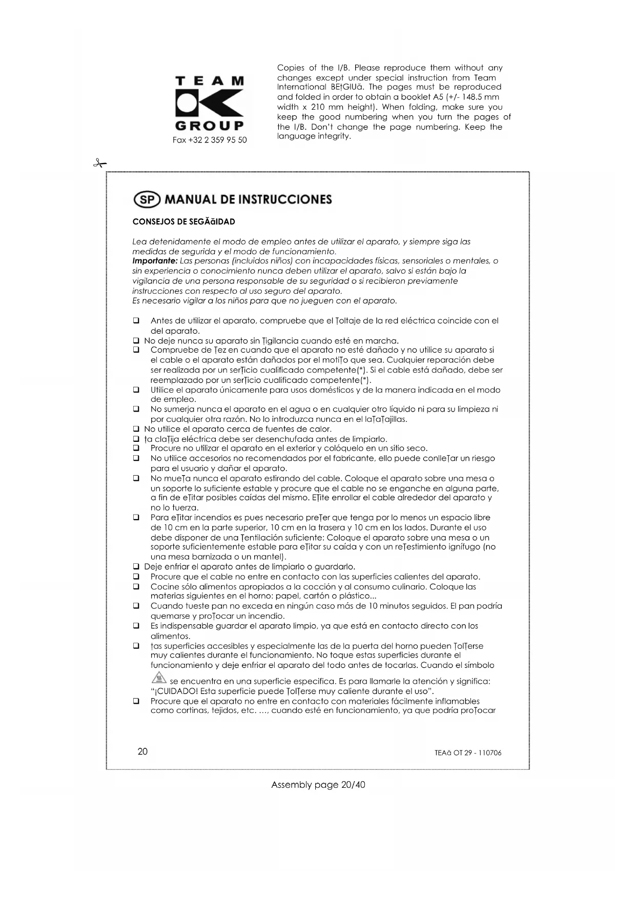 Encuentra gratis el manual del aparato OT 29 TEAM en formato PDF.