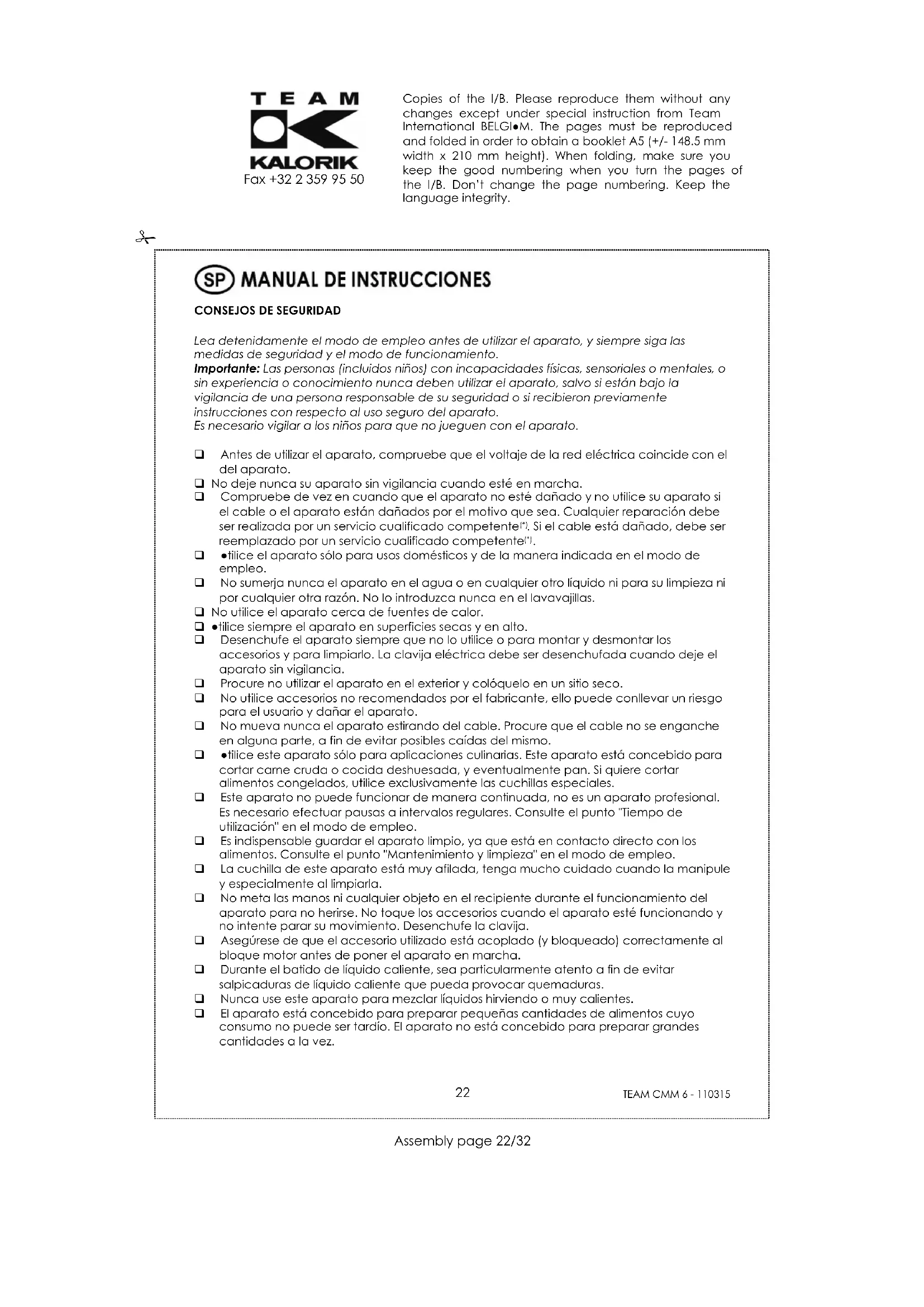 Para una utilización optima de su aparato yeatingel deterioro de su motor, controle el tiempo deutilización continua maxima indicada en la placar decharacteristicas (KB xx min.donde xx es el duración maxima). Pausa de Utilización: 10 Minutes.