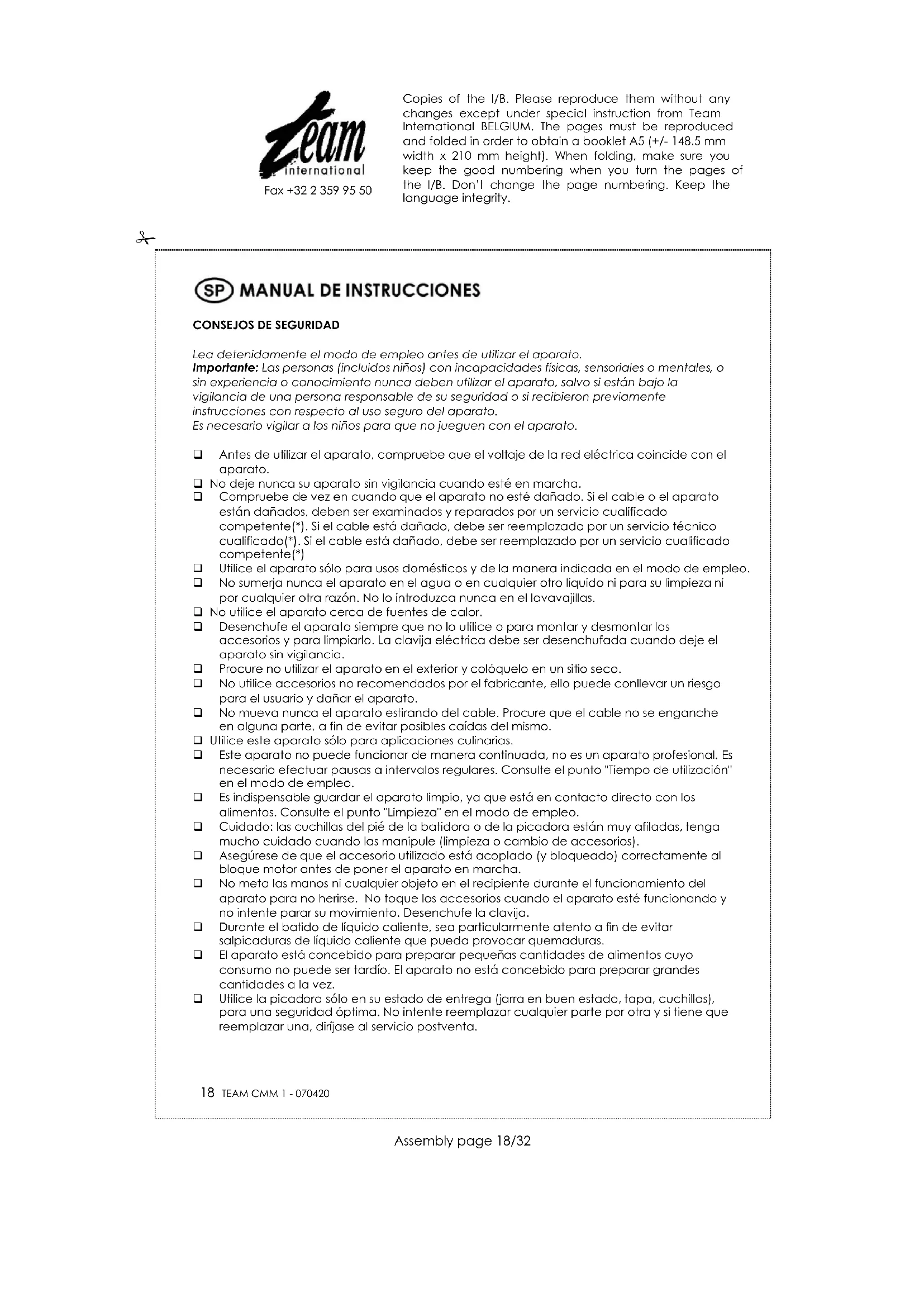 Este accesorio le permite picar condimentos, frutos secos o carne. Para la carne, le aconsejamos que la corte en pedazos previamente. Asegúrese de que el aparato esté desenchufado. Inserte la cuchilla en el sitio previsto en el fondo de la jarra. Inserte el bloque motor en la abertura de la tapa, de tal manera que las flechas del aparato y de la tapa se encuentren frente a frente. Dele al picador un cuarto de vuelta en el sentido de las agujas del reloj. Compruebe el cierre tirando ligeramente de él. Coloque la tapa en la jarra respetando la posición de las muescas. Si es necesario, mueva la tapa hasta que baje a ras de la jarra. Es posible que la tapa se coloque mal; gire ligeramente las cuchillas para insertarlas correctamente. Compruebe el bloqueo tirando ligeramente de la tapa. No se olvide de quitar todos los accesorios del aparato. Es necesario coger el aparato por su asa durante el funcionamiento. Para quitar el picador, proceda en el modo contrario. Cuídese cuando limpie el picador, pues las cuchillas son afiladas. LIMPIEZA Siempre desenchufe el aparato antes de limpiar el aparato. Quite los accesorios antes de limpiarlos en agua jabonosa. No utilice paños abrasivos para limpiar los materiales de plástico. Enjuague con agua clara y deje secar antes de volver a usar el aparato. No meta ningún accesorio en el lavavajillas. Seque el aparato con un papel absorbente o un paño suave ligeramente húmedo. No limpie nunca el aparato con productos abrasivos, pues podría dañar el revestimiento. No sumerja nunca el bloque motor en el agua o en cualquier otro líquido. PROTECCIÓN DEL MEDIO AMBIENTE –DIRECTIVA 2002/96/CE Para poder preservar nuestro medio ambiente y proteger la salud humana, los residuos eléctricos y equipos electrónicos deberían ser destruidos de acuerdo con unas normas especificas con la implicación de ambos proveedores y consumidores. Por esta razón, como indica el símbolo en la placa de datos técnicos, su aparato no debería ser tirado en un contenedor municipal sino que debería ser devuelto a la tienda, o dejado en un punto de recolección para ser reciclado o usado para otras aplicaciones conforme a la directiva. Copies of the I/B. Please reproduce them without any changes except under special instruction from Team International BELGIUM. The pages must be reproduced and folded in order to obtain a booklet A5 (+/- 148.5 mm width x 210 mm height). When folding, make sure you keep the good numbering when you turn the pages of the I/B. Don’t change the page numbering. Keep the language integrity.
