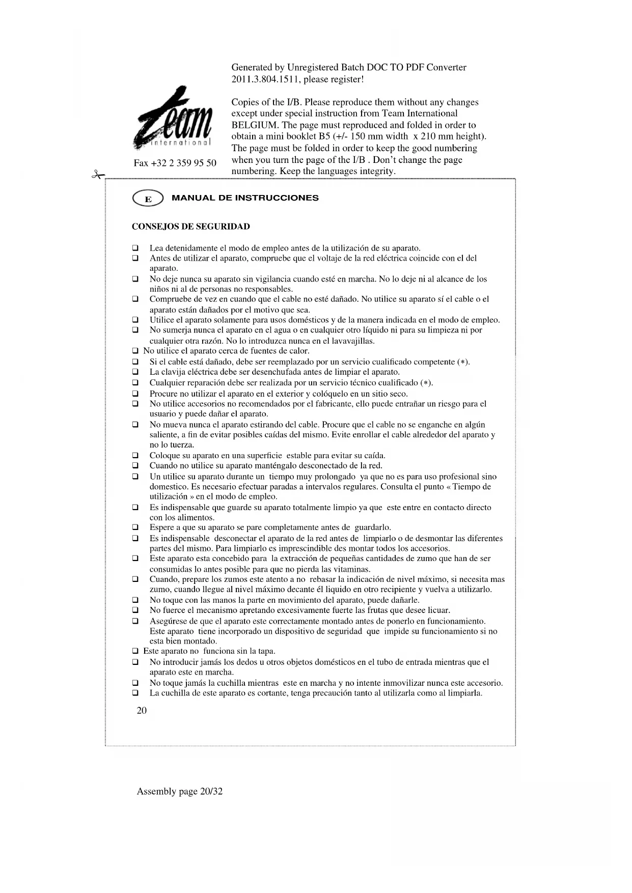 INDICACIONES Este aparato esta concebido para una extracción pequeña de zumo. Puede utilizar diferentes frutas y legumbres, unas detrás de otras sin tener que limpiar el aparato entre ellas. Los sabores no se mezclan jamas Los zumos han de ser consumidos lo antes posible para que conserven todas sus vitaminas. Si desea conservar los zumos algunas horas, puede agregarle unas gotas de limón. ATENCION Utilice siempre frutas ricas en zumo. No utilice nunca frutos como el coco que por su solidez y composición pueden dañar el aparato Pele y quite las pepitas de las frutas que así lo necesiten. LIMPIEZA Apagar el aparato y desconectar de la red. Quitar las grapas y la tapa de seguridad. Quitar el bloque de separación y desmontar el filtro y la cuchilla. Vaciar el deposito de los residuos. Limpiar estas partes con agua corriente. Para limpiar la cuchilla y el filtro, utilizar un paño suave, no las limpie nunca en el lavavajillas. Para Limpiar el bloque del motor, utilice un paño húmedo. Un utilice nunca productos abrasivos. No introduzca nunca el aparato en agua u otros productos ni para limpiarlos ni por cualquier otra razón. No introduzca nunca el aparato en el lavavajillas.Generated by Unregistered Batch DOC TO PDF Converter 2011.3.804.1511, please register! Copies of the I/B. Please reproduce them without any changes except under special instruction from Team International BELGIUM. The page must reproduced and folded in order to obtain a mini booklet B5 (+/- 150 mm width x 210 mm height). The page must be folded in order to keep the good numbering when you turn the page of the I/B . Don’t change the page numbering. Keep the languages integrity.