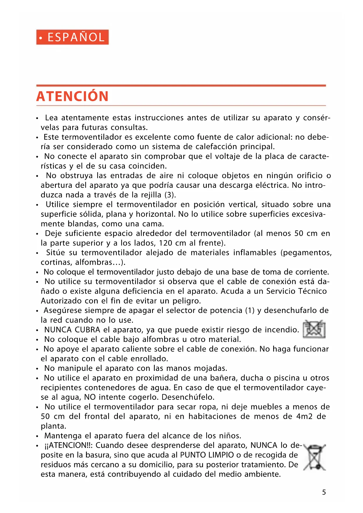- No utilice el termoventilador para secar ropa, ni deje muebles a menos de 50 cm del frontal del aparato, ni en habitaciones de menos de 4m2 de planta.