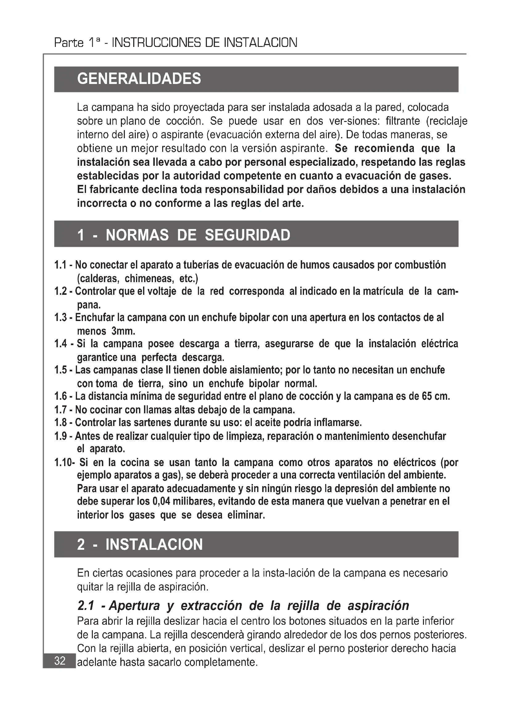 el aparato. 1.10- Si en la cocina se usan tanto la campana como otros aparatos no eléctricos (por ejemplo aparatos a gas), se deberà proceder a una correcta ventilación del ambiente. Para usar el aparato adecuadamente y sin ningún riesgo la depresión del ambiente no debe superar los 0,04 milibares, evitando de esta manera que vuelvan a penetrar en el interior los gases que se desea eliminar.