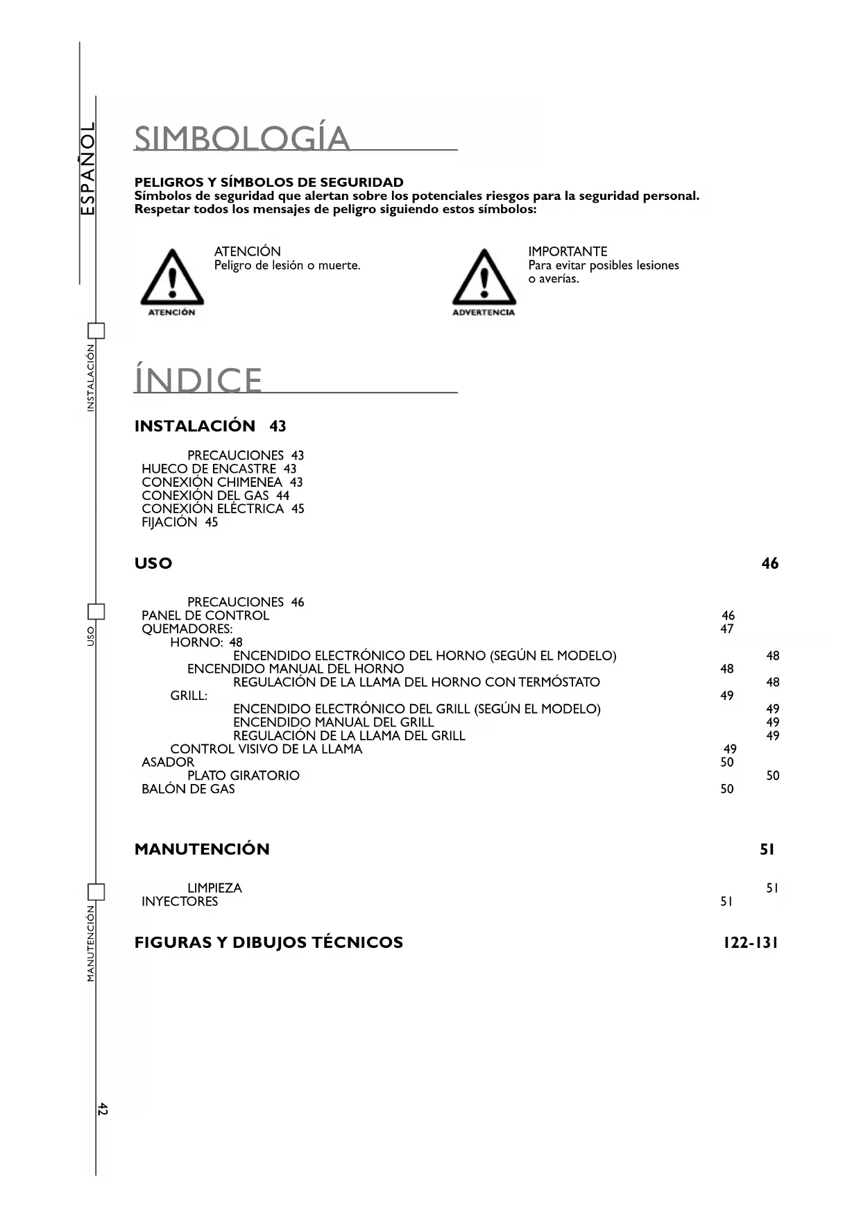 ATENCIÓN Peligro de lesión o muerte. IMPORTANTE Para evitar posibles lesiones o averías. 42INSTALACIÓNUSO MANUTENCIÓN