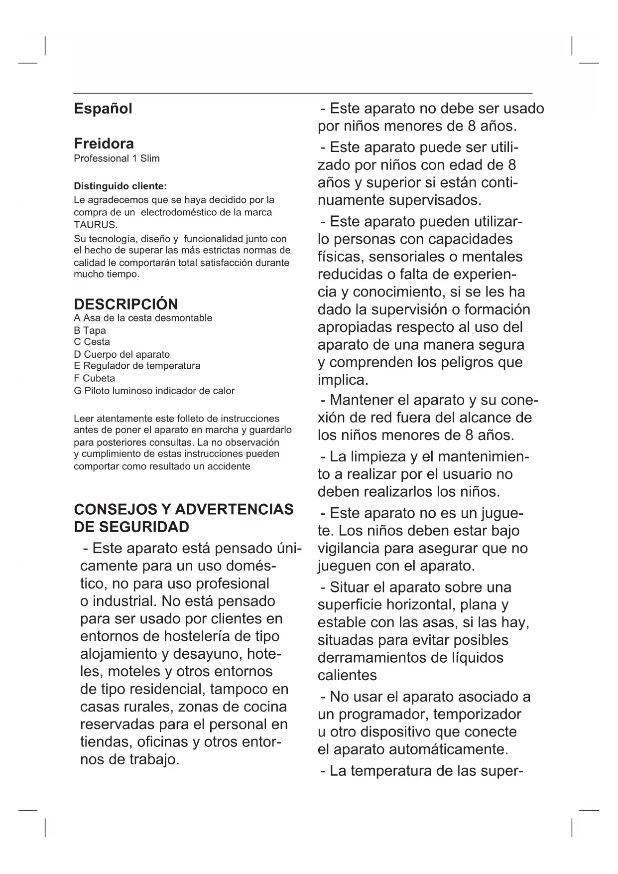 DUCTO - Los materiales que constituyen el envase de este aparato, están integrados en un sistema de recogida, clasicación y reciclado de los mismos. Si desea deshacerse de ellos, puede utilizar los contenedores públicos apropiados para cada tipo de material. - El producto está exento de concentraciones de sustancias que se puedan considerar dañinas para el medio ambiente. - Este aparato contiene o puede contener aceite, recordar que deben respetarse las reglamenta- ciones concernientes a la eliminación de este tipo de contaminante. Este símbolo signica que si desea deshacerse del producto, una vez transcurrida la vida del mismo, debe depositarlo por los medios adecuados a manos de un gestor de residuos autoriza- do para la recogida selectiva de Residuos de Aparatos Eléctricos y Electrónicos (RAEE). Este aparato cumple con la Directiva 2014/35/EU de Baja Tensión, con la Directiva 2014/30/EU de Compatibilidad Electromagnética, con la Directiva 2011/65/EU sobre restricciones a la utilización de determinadas sustancias peligrosas en apara- tos eléctricos y electrónicos y con la Directiva 2009/125/EC sobre los requisitos de diseño ecológico aplicable a los productos relacionados con la energía.Català Fregidora Professional 1 Slim Benvolgut client, Us agraïm que us hàgiu decidit a comprar un producte de la marca TAURUS. La seva tecnologia, disseny i funcionalitat, i el fet d’haver superat les normes de qualitat més estric- tes, us garanteixen una satisfacció total durant molt de temps. DESCRIPCIÓ A Nansa de la cistella desmuntable B Tapa C Cistell D Cos de l’aparell E Regulador de temperatura F Cubeta G Pilot lluminós indicador de calor Abans d’engegar l’aparell, llegiu atentament aquest full d’instruccions i conserveu-lo per a consultes posteriors. La no-observació i l’incompliment d’aquestes instruccions pot donar lloc a accidents.