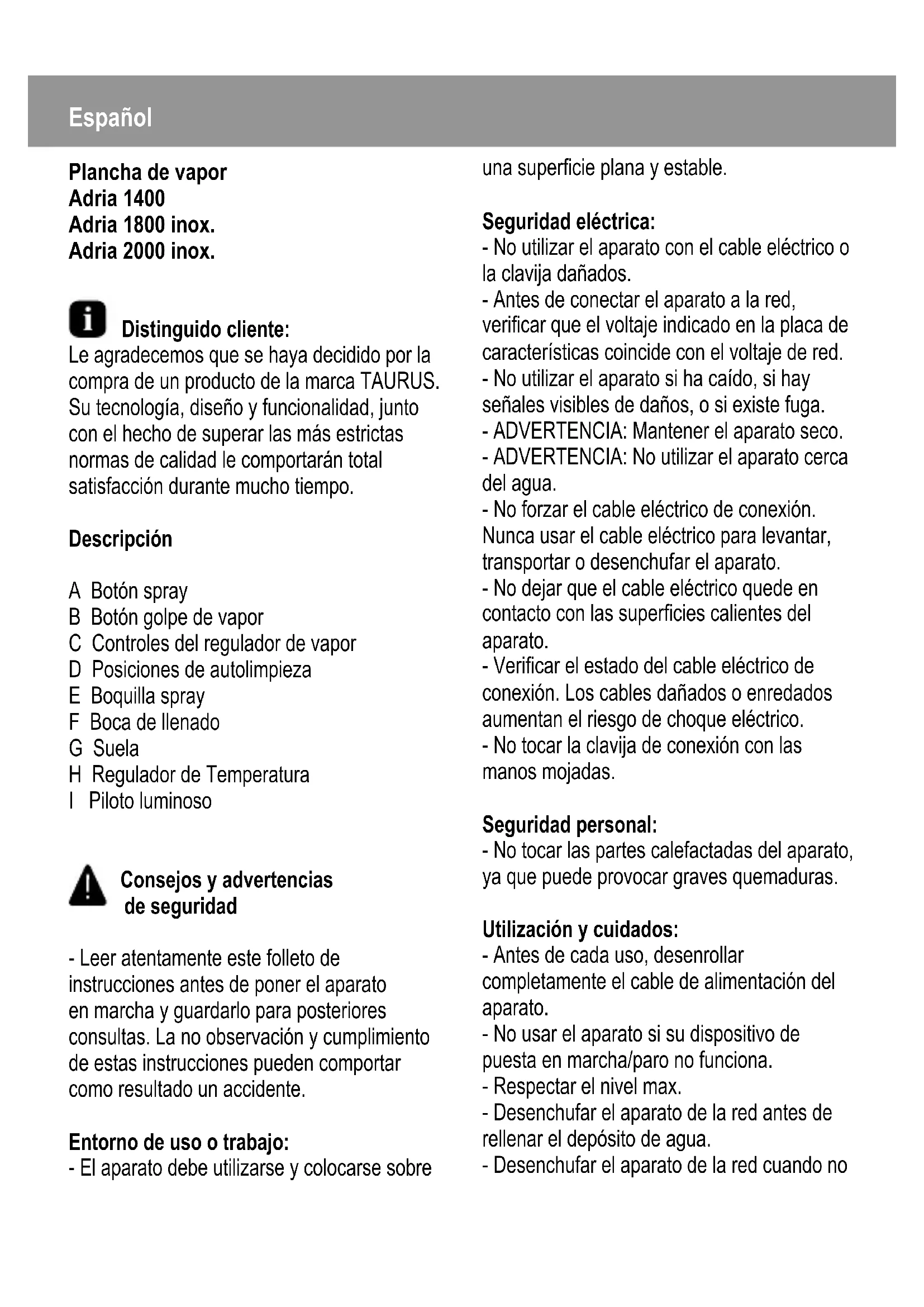 HEspañol Plancha de vapor Adria 1400 Adria 1800 inox. Adria 2000 inox. Distinguido cliente: Le agradecemos que se haya decidido por la compra de un producto de la marca TAURUS. Su tecnología, diseño y funcionalidad, junto con el hecho de superar las más estrictas normas de calidad le comportarán total satisfacción durante mucho tiempo. Descripción A Botón spray B Botón golpe de vapor C Controles del regulador de vapor D Posiciones de autolimpieza E Boquilla spray F Boca de llenado G Suela H Regulador de Temperatura I Piloto luminoso