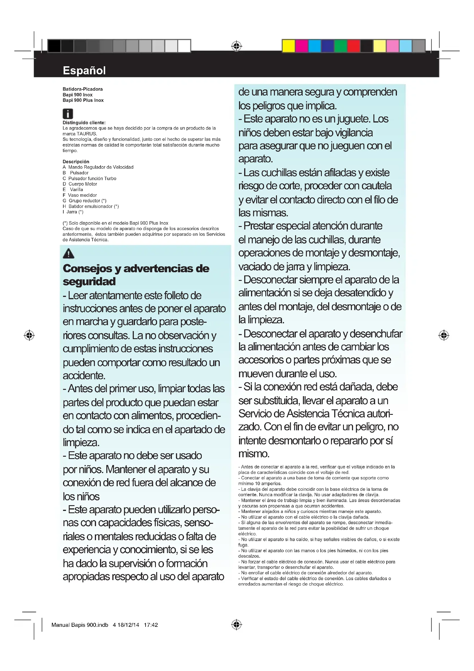 Manual Bapis 900.indb 5 18/12/14 17:42Español Batidora-Picadora Bapi 900 Inox Bapi 900 Plus Inox Distinguido cliente: Le agradecemos que se haya decidido por la compra de un producto de la marca TAURUS. Su tecnología, diseño y funcionalidad, junto con el hecho de superar las más estrictas normas de calidad le comportarán total satisfacción durante mucho tiempo. Descripción A Mando Regulador de Velocidad B Pulsador C Pulsador función Turbo D Cuerpo Motor E Varilla F Vaso medidor G Grupo reductor (*) H Batidor emulsionador (*) I Jarra (*) (*) Solo disponible en el modelo Bapi 900 Plus Inox Caso de que su modelo de aparato no disponga de los accesorios descritos anteriormente, éstos también pueden adquirirse por separado en los Servicios de Asistencia Técnica. Consejos y advertencias de seguridad - Leer atentamente este folleto de instrucciones antes de poner el aparato en marcha y guardarlo para poste- riores consultas. La no observación y cumplimiento de estas instrucciones pueden comportar como resultado un accidente. - Antes del primer uso, limpiar todas las partes del producto que puedan estar en contacto con alimentos, procedien- do tal como se indica en el apartado de limpieza. - Este aparato no debe ser usado por niños. Mantener el aparato y su conexión de red fuera del alcance de los niños - Este aparato pueden utilizarlo perso- nas con capacidades físicas, senso- riales o mentales reducidas o falta de experiencia y conocimiento, si se les ha dado la supervisión o formación apropiadas respecto al uso del aparato de una manera segura y comprenden los peligros que implica. - Este aparato no es un juguete. Los niños deben estar bajo vigilancia para asegurar que no jueguen con el aparato. - Las cuchillas están afiladas y existe riesgo de corte, proceder con cautela y evitar el contacto directo con el filo de las mismas. - Prestar especial atención durante el manejo de las cuchillas, durante operaciones de montaje y desmontaje, vaciado de jarra y limpieza. - Desconectar siempre el aparato de la alimentación si se deja desatendido y antes del montaje, del desmontaje o de la limpieza. - Desconectar el aparato y desenchufar la alimentación antes de cambiar los accesorios o partes próximas que se mueven durante el uso. - Si la conexión red está dañada, debe ser substituida, llevar el aparato a un Servicio de Asistencia Técnica autori- zado. Con el fin de evitar un peligro, no intente desmontarlo o repararlo por sí mismo. - Antes de conectar el aparato a la red, vericar que el voltaje indicado en la placa de características coincide con el voltaje de red. - Conectar el aparato a una base de toma de corriente que soporte como mínimo 10 amperios. - La clavija del aparato debe coincidir con la base eléctrica de la toma de corriente. Nunca modicar la clavija. No usar adaptadores de clavija. - Mantener el área de trabajo limpia y bien iluminada. Las áreas desordenadas y oscuras son propensas a que ocurran accidentes. - Mantener alejados a niños y curiosos mientras maneje este aparato. - No utilizar el aparato con el cable eléctrico o la clavija dañada. - Si alguna de las envolventes del aparato se rompe, desconectar inmedia- tamente el aparato de la red para evitar la posibilidad de sufrir un choque eléctrico. - No utilizar el aparato si ha caído, si hay señales visibles de daños, o si existe fuga. - No utilizar el aparato con las manos o los pies húmedos, ni con los pies descalzos. - No forzar el cable eléctrico de conexión. Nunca usar el cable eléctrico para levantar, transportar o desenchufar el aparato. - No enrollar el cable eléctrico de conexión alrededor del aparato. - Vericar el estado del cable eléctrico de conexión. Los cables dañados o enredados aumentan el riesgo de choque eléctrico. Manual Bapis 900.indb 4 18/12/14 17:42- No utilizar ni guardar el aparato a la intemperie. - No tocar la clavija de conexión con las manos mojadas. - Tomar las medidas necesarias para evitar la puesta en marcha no intencio- nada del aparato. - No tocar las partes móviles del aparato en marcha. Utilización y cuidados: - No usar el aparato si sus accesorios no están debidamente acoplados. - No utilizar el aparato en vacío, o sea sin carga. - No usar el aparato si su dispositivo de puesta en marcha/paro no funciona. - Respetar la indicación de nivel MAX (Fig. 3) - No agregar un volumen de líquido caliente superior a la mitad de la capacidad de la jarra, y en todo caso si existen líquidos calientes en el interior de la jarra, usar solamente la velocidad más lenta. - Desenchufar el aparato de la red cuando no se use y antes de realizar cual- quier operación de limpieza, ajuste, carga o cambio de accesorios. - Este aparato está pensado únicamente para un uso doméstico, no para uso profesional o industrial - Guardar este aparato fuera del alcance de los niños y/o personas discapa- citadas. - Mantener el aparato en buen estado. Compruebe que las partes móviles no estén desalineadas o trabadas, que no haya piezas rotas u otras condiciones que puedan afectar al buen funcionamiento del aparato. - No dejar nunca el aparato conectado y sin vigilancia. Además ahorrará energía y prolongará la vida del aparato. - No usar el aparato durante más de 1 minuto seguido, o realizando ciclos de más de 5 minutos, en este caso respetando siempre periodos de reposo entre ciclos de 1 minuto como mínimo. En ningún caso es conveniente tener el aparato en funcionamiento durante más del tiempo necesario. - Como orientación en la tabla anexa se indican una serie de recetas, que incluyen la cantidad de alimento a procesar y el tiempo de funcionamiento del aparato. - No utilizar el aparato sobre ninguna parte del cuerpo de una persona o animal. - No usar el aparato con alimentos congelados o huesos. Servicio: - Toda utilización inadecuada, o en desacuerdo con las instrucciones de uso, puede comportar peligro, anulando la garantía y la responsabilidad del fabrica