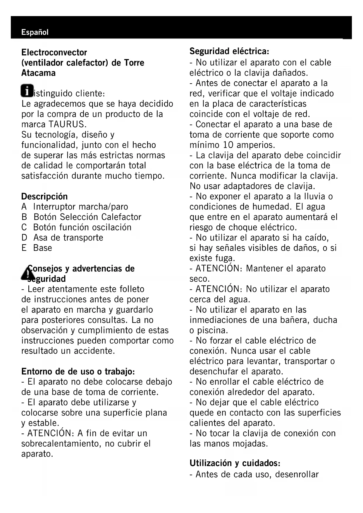 DElectroconvector (ventilador calefactor) de Torre Atacama Distinguido cliente: Le agradecemos que se haya decidido por la compra de un producto de la marca TAURUS. Su tecnología, diseño y funcionalidad, junto con el hecho de superar las más estrictas normas de calidad le comportarán total satisfacción durante mucho tiempo. Descripción A Interruptor marcha/paro B Botón Selección Calefactor C Botón función oscilación D Asa de transporte E Base Consejos y advertencias de seguridad - Leer atentamente este folleto de instrucciones antes de poner el aparato en marcha y guardarlo para posteriores consultas. La no observación y cumplimiento de estas instrucciones pueden comportar como resultado un accidente. Entorno de de uso o trabajo: - El aparato no debe colocarse debajo de una base de toma de corriente. - El aparato debe utilizarse y colocarse sobre una superficie plana y estable. - ATENCIÓN: A fin de evitar un sobrecalentamiento, no cubrir el aparato. Seguridad eléctrica: - No utilizar el aparato con el cable eléctrico o la clavija dañados. - Antes de conectar el aparato a la red, verificar que el voltaje indicado en la placa de características coincide con el voltaje de red. - Conectar el aparato a una base de toma de corriente que soporte como mínimo 10 amperios. - La clavija del aparato debe coincidir con la base eléctrica de la toma de corriente. Nunca modificar la clavija. No usar adaptadores de clavija. - No exponer el aparato a la lluvia o condiciones de humedad. El agua que entre en el aparato aumentará el riesgo de choque eléctrico. - No utilizar el aparato si ha caído, si hay señales visibles de daños, o si existe fuga. - ATENCIÓN: Mantener el aparato seco. - ATENCIÓN: No utilizar el aparato cerca del agua. - No utilizar el aparato en las inmediaciones de una bañera, ducha o piscina. - No forzar el cable eléctrico de conexión. Nunca usar el cable eléctrico para levantar, transportar o desenchufar el aparato. - No enrollar el cable eléctrico de conexión alrededor del aparato. - No dejar que el cable eléctrico quede en contacto con las superficies calientes del aparato. - No tocar la clavija de conexión con las manos mojadas. Utilización y cuidados: - Antes de cada uso, desenrollar Españolcompletamente el cable de alimentación del aparato. - No usar el aparato si su dispositivo de puesta en marcha/paro no funciona. - No retirar los pies base del aparato. - No mover el aparato mientras está en uso. - Si se usa el aparato en un cuarto de baño o similar, desenchufar el aparato de la red cuando no se use, aunque sea por poco tiempo, ya que la proximidad del agua presenta un riesgo, incluso en el caso de que el aparato esté desconectado. - Desenchufar el aparato de la red cuando no se use y antes de realizar cualquier operación de limpieza. - Este aparato está pensado únicamente para un uso doméstico, no para uso profesional o industrial. - Este aparato no es un juguete. Los niños deben estar bajo vigilancia para asegurar que no jueguen con el aparato. - Este aparato está pensado para que lo usen adultos. No permitir que lo usen personas no familiarizadas con este tipo de producto, personas discapacitadas o niños. - Guardar este aparato fuera del alcance de los niños y/o personas discapacitadas. - Este aparato no esta equipado con un dispositivo de control de temperatura ambiente. No usar este aparato en habitaciones pequeñas que estén ocupadas por personas discapacitadas que no sean capaces de abandonar la habitación por sus medios, a menos que estén sometidas una vigilancia constante. - No exponer el aparato a temperaturas extremas. Toda utilización inadecuada, o en desacuerdo con las instrucciones de uso, puede comportar peligro, anulando la garantía y la responsabilidad del fabricante. Instalación - La clavija debe ser fácilmente accesible para poder desconectarla en caso de emergencia. - El aparato debe funcionar con sus pies base acoplados. Montaje de la base: - Para montar la base, colocar el aparato boca abajo. - Posicionar la base al cuerpo del aparato. - Fijar la base mediante las palomillas suministradas. - Volver a dar la vuelta al aparato y comprobar el buen funcionamiento de la base. Modo de empleo Uso: - Desenrollar completamente el cable antes de enchufar. - Enchufar el aparato a la red eléctrica. - Poner en marcha el aparato, utilizando el interruptor de marcha/ paro. - Seleccionar la potencia deseada. Función oscilación: - La función oscilación permite dirigir el flujo de aire que sale del aparato para que vaya cubriendoalternativamente y de modo automático un radio de hasta 75º - Para activar esta función pulse botón (C). - Para desactivarla, realice la operación inversa. Una vez finalizado el uso del aparato: - Parar el aparato, retirando la presión sobre el botón marcha/paro. - Desenchufar el aparato de la red eléctrica. Asa(s) de transporte: - Este aparato dispone de un asa en su parte trasera para hacer fácil y cómodo su transporte (D). Limpieza - Desenchufar el aparato de la red y dejarlo enfriar antes de iniciar cualquier operación de limpieza. - Limpiar el conjunto eléctrico y el conector de red con un paño húmedo y secarlos después. NO