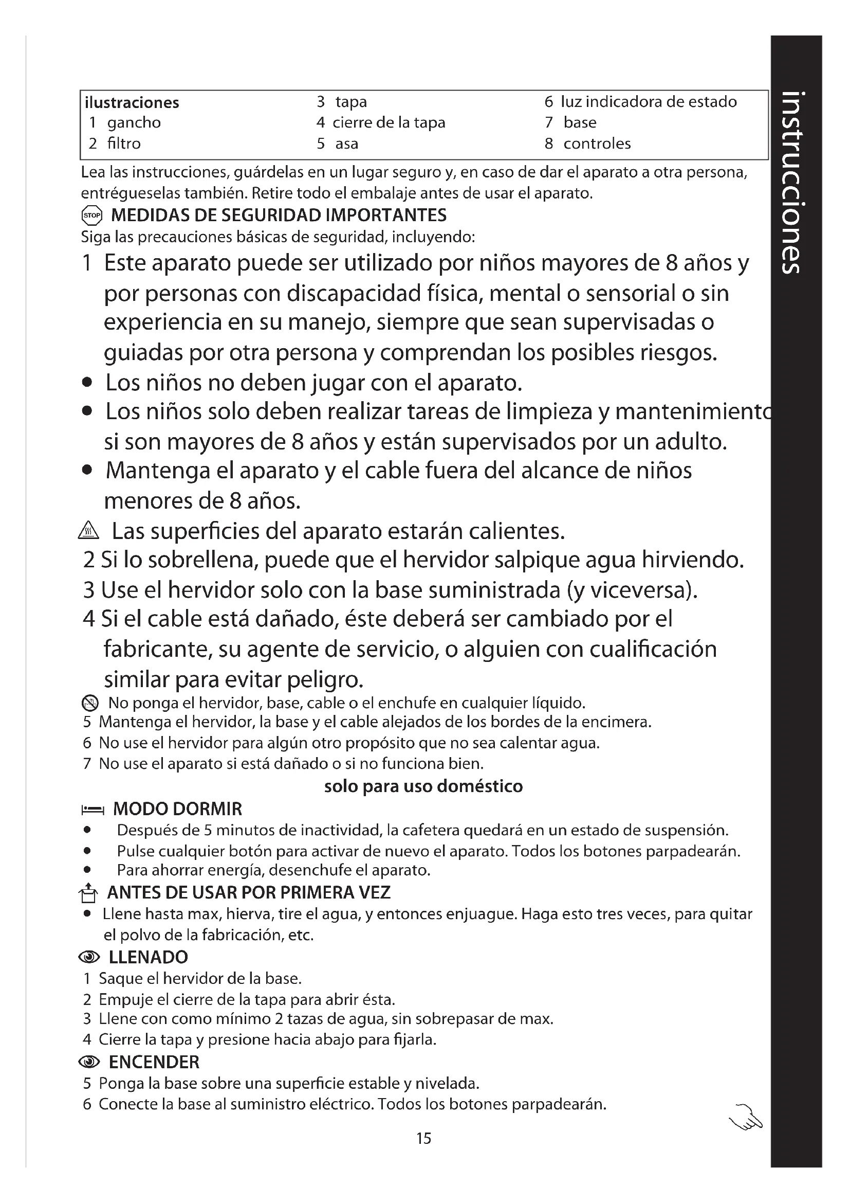 - Mantenga el aparato y el cable fuera del alcance de niños menores de 8 años. ¬ Las superficies del aparato estarán calientes. 2 Si lo sobrellena, puede que el hervidor salpique agua hirviendo. 3 Use el hervidor solo con la base suministrada (y viceversa). 4 Si el cable está dañado, éste deberá ser cambiado por el fabricante, su agente de servicio, o alguien con cualificación similar para evitar peligro. H No ponga el hervidor, base, cable o el enchufe en cualquier líquido. 5 Mantenga el hervidor, la base y el cable alejados de los bordes de la encimera. 6 No use el hervidor para algún otro propósito que no sea calentar agua. 7 No use el aparato si está dañado o si no funciona bien. solo para uso doméstico