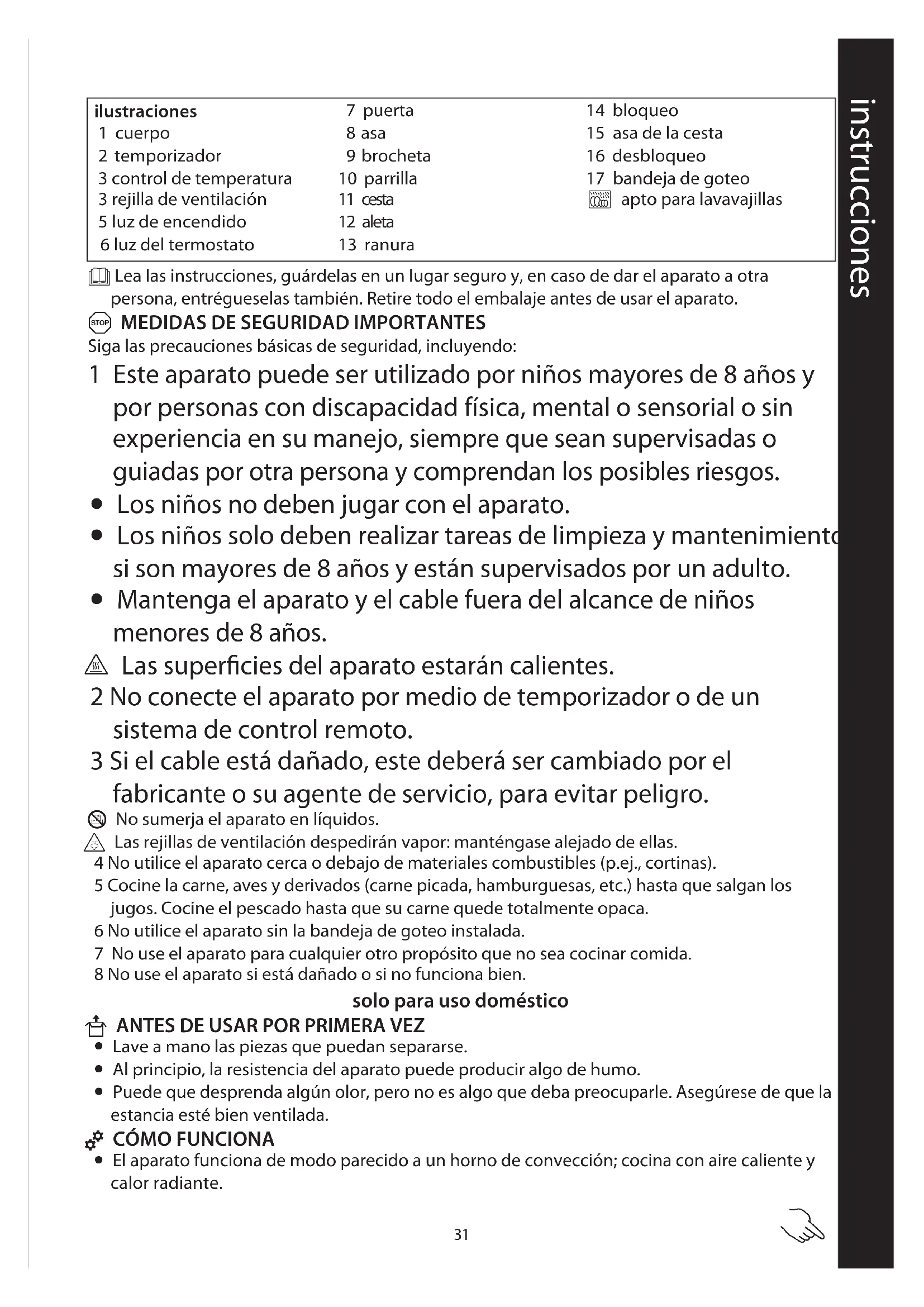 - El aparato funciona de modo parecido a un horno de convección; cocina con aire caliente y calor radiante. instrucciones ilustraciones 1 cuerpo 2 temporizador 3 control de temperatura 3 rejilla de ventilación 5 luz de encendido 6 luz del termostato 7 puerta 8 asa 9 brocheta 10 parrilla 11 cesta 12 aleta 13 ranura 14 bloqueo 15 asa de la cesta 16 desbloqueo 17 bandeja de goteo ` apto para lavavajillas32