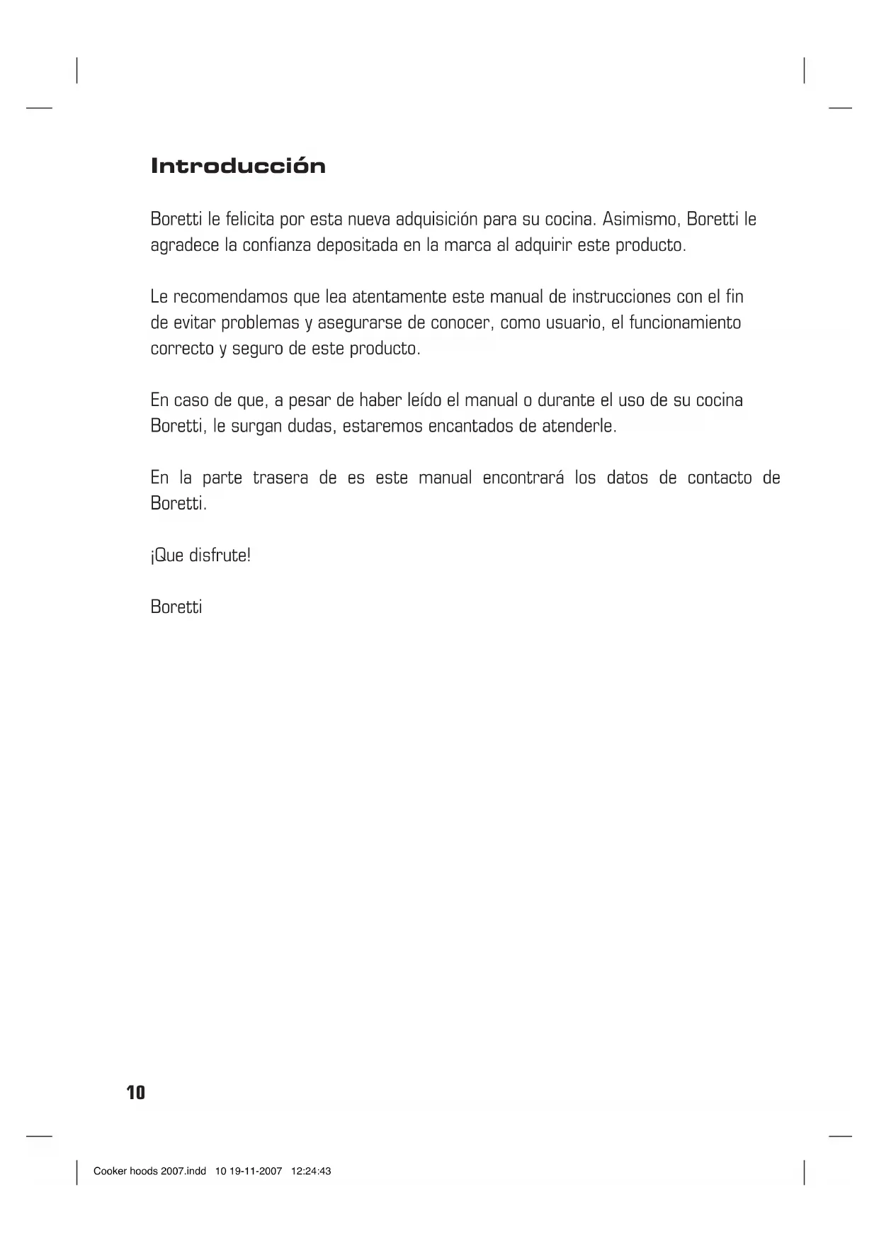 Mantenimiento Antes de cualquier trabajo de mantenimiento desconectar la campana de la corriente. Limpieza La campana debe ser limpiada con frecuencia tanto externamente como internamente. Para limpiarla use un paño empapado de alcohol desnaturalizado y detergentes líquidos neu- tros. Evite el uso de productos que contengan abrasivos. Atención: Si no se respetan las normas de limpieza de la campana y del cambio y limpieza de los filtros puede haber riesgo de incendio. Rogamos se atenga a las instrucciones indicadas. Filtro antigrasa: Tiene que ser limpiado una vez al mes, con de- tergentes no agresivos, manualmente o en el lavavajillas a temperaturas bajas y con un ciclo de lavado breve. Con el lavado en el lavavajilla el filtro antigrasa metálico puede desteñirse pero sus características de filtrado no cambian ab- solutamente. Filtro al carbòn (solo para la versiòn filtrante) El filtro a los carbones activos F no es ni lavable ni regenerable. El filtro al carbón tiene que ser reemplazado cada 4 meses cuando la campana se usa normalmente. Retiene los malos olores derivantes de la cocciòn. Substituciòn làmparas Atención! Antes de tocar la bombilla, com- pruebe que está fría. Extraiga cuidadosamente el cristal de la bombilla con un destornillador (consulte las ilustraciones de las últimas pági- nas). Sustituya la bombilla rota. Use sólo bom- billas halógenas de 20W como máximo y no las toque con la mano desnuda. A continuación, vuelva a colocar el cristal de la bombilla. Advertencias No use nunca la campana sin haber montado correctamente la rejilla. El aire aspirado no debe ser canalizado en un conducto usado para la descarga de humos de aparatos alimentados con energía que no sea eléctrica.Hay que reali- zar anteriormente una adecuada aireación del local cuando se usen al mismo tiempo la cam- pana y los aparatos alimentados con otra ener- gía que no sea eléctrica. Está rigurosamente prohibido cocinar alimentos a la llama debajo de la campana. El empleo de la llama libre daña los filtros y puede provocar incendios, por lo tanto debe evitarse en cualquier caso. Cuando se fríen los alimentos se debe tener cuidado de que el aceite no se caliente en exceso y se incendie. Para las medidas técnicas y de segu- ridad que haya que adoptar para la descarga de los humos aténgase rigurosamente a lo que diga el reglamento de las autoridades locales competentes. Cooker hoods 2007.indd 13 19-11-2007 12:24:4414 Introduction Boretti would like to congratulate you on your new kitchen purchase, and to thank you for choosing a Boretti brand product. Please read this manual carefully before going on to use the product. This will prevent possible problems and ensure that you are aware of the correct and safe use of this product In the event that queries arise once you have read the manual or at any time during the use of your Boretti product, we will be happy to help you. Please refer to the back cover of this manual for Boretti’s contact details. We hope you enjoy the product! Boretti Cooker hoods 2007.indd 14 19-11-2007 12:24:44NL
