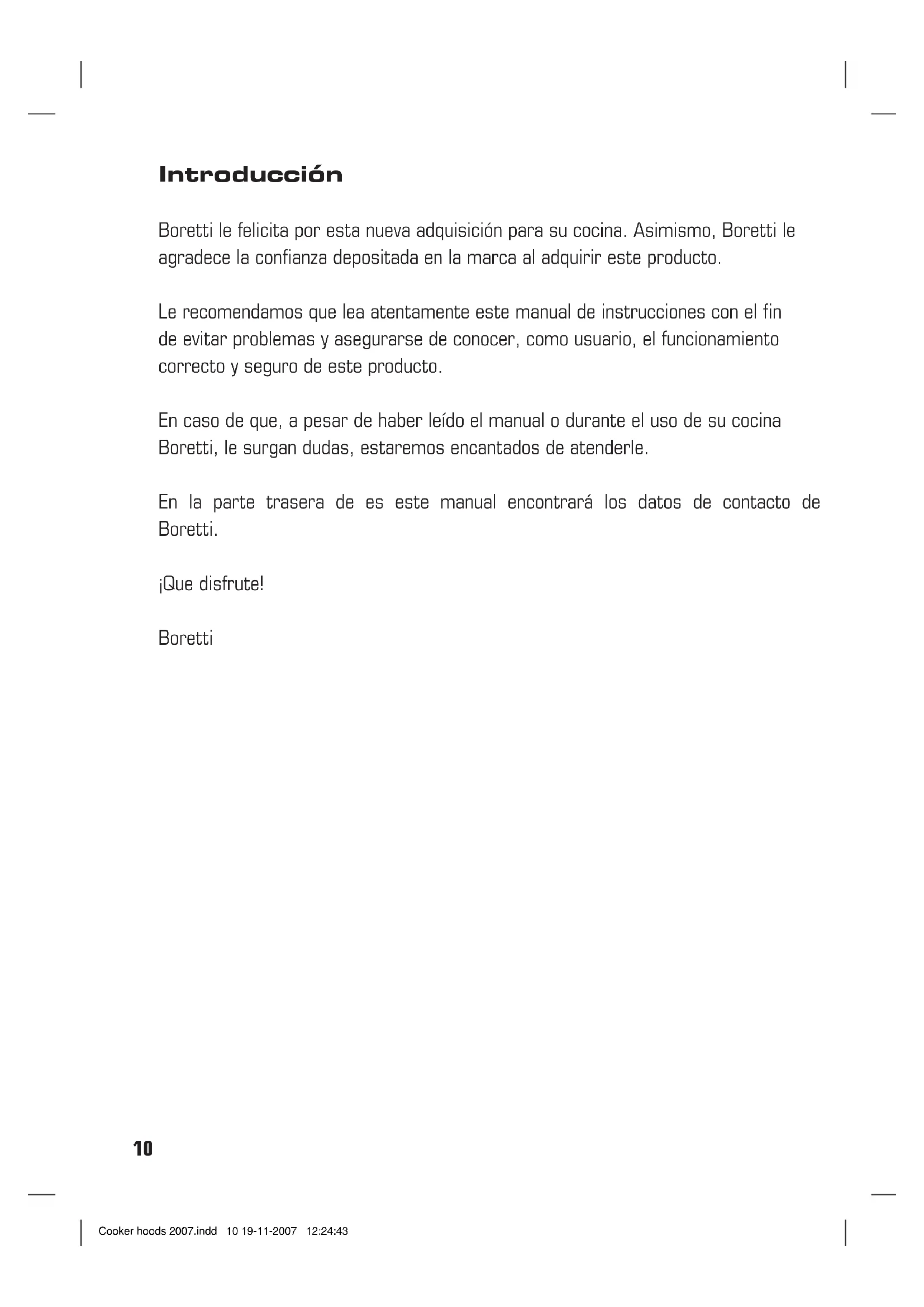 Mantenimiento Antes de cualquier trabajo de mantenimiento desconectar la campana de la corriente. Limpieza La campana debe ser limpiada con frecuencia tanto externamente como internamente. Para limpiarla use un paño empapado de alcohol desnaturalizado y detergentes líquidos neu- tros. Evite el uso de productos que contengan abrasivos. Atención: Si no se respetan las normas de limpieza de la campana y del cambio y limpieza de los filtros puede haber riesgo de incendio. Rogamos se atenga a las instrucciones indicadas. Filtro antigrasa: Tiene que ser limpiado una vez al mes, con de- tergentes no agresivos, manualmente o en el lavavajillas a temperaturas bajas y con un ciclo de lavado breve. Con el lavado en el lavavajilla el filtro antigrasa metálico puede desteñirse pero sus características de filtrado no cambian ab- solutamente. Filtro al carbòn (solo para la versiòn filtrante) El filtro a los carbones activos F no es ni lavable ni regenerable. El filtro al carbón tiene que ser reemplazado cada 4 meses cuando la campana se usa normalmente. Retiene los malos olores derivantes de la cocciòn. Substituciòn làmparas Atención! Antes de tocar la bombilla, com- pruebe que está fría. Extraiga cuidadosamente el cristal de la bombilla con un destornillador (consulte las ilustraciones de las últimas pági- nas). Sustituya la bombilla rota. Use sólo bom- billas halógenas de 20W como máximo y no las toque con la mano desnuda. A continuación, vuelva a colocar el cristal de la bombilla. Advertencias No use nunca la campana sin haber montado correctamente la rejilla. El aire aspirado no debe ser canalizado en un conducto usado para la descarga de humos de aparatos alimentados con energía que no sea eléctrica.Hay que reali- zar anteriormente una adecuada aireación del local cuando se usen al mismo tiempo la cam- pana y los aparatos alimentados con otra ener- gía que no sea eléctrica. Está rigurosamente prohibido cocinar alimentos a la llama debajo de la campana. El empleo de la llama libre daña los filtros y puede provocar incendios, por lo tanto debe evitarse en cualquier caso. Cuando se fríen los alimentos se debe tener cuidado de que el aceite no se caliente en exceso y se incendie. Para las medidas técnicas y de segu- ridad que haya que adoptar para la descarga de los humos aténgase rigurosamente a lo que diga el reglamento de las autoridades locales competentes. Cooker hoods 2007.indd 13 19-11-2007 12:24:4414 Introduction Boretti would like to congratulate you on your new kitchen purchase, and to thank you for choosing a Boretti brand product. Please read this manual carefully before going on to use the product. This will prevent possible problems and ensure that you are aware of the correct and safe use of this product In the event that queries arise once you have read the manual or at any time during the use of your Boretti product, we will be happy to help you. Please refer to the back cover of this manual for Boretti’s contact details. We hope you enjoy the product! Boretti Cooker hoods 2007.indd 14 19-11-2007 12:24:44NL