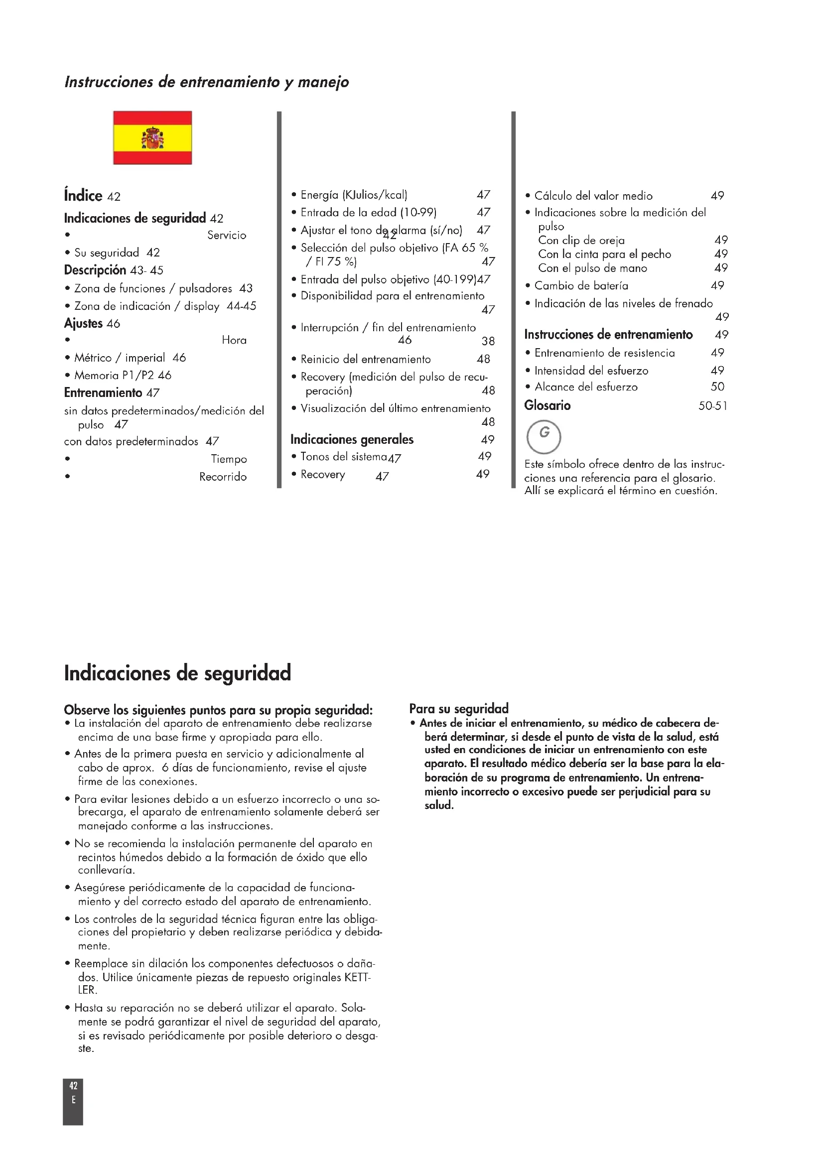 Instrucciones de entrenamiento y manejo Índice 42 Indicaciones de seguridad 42