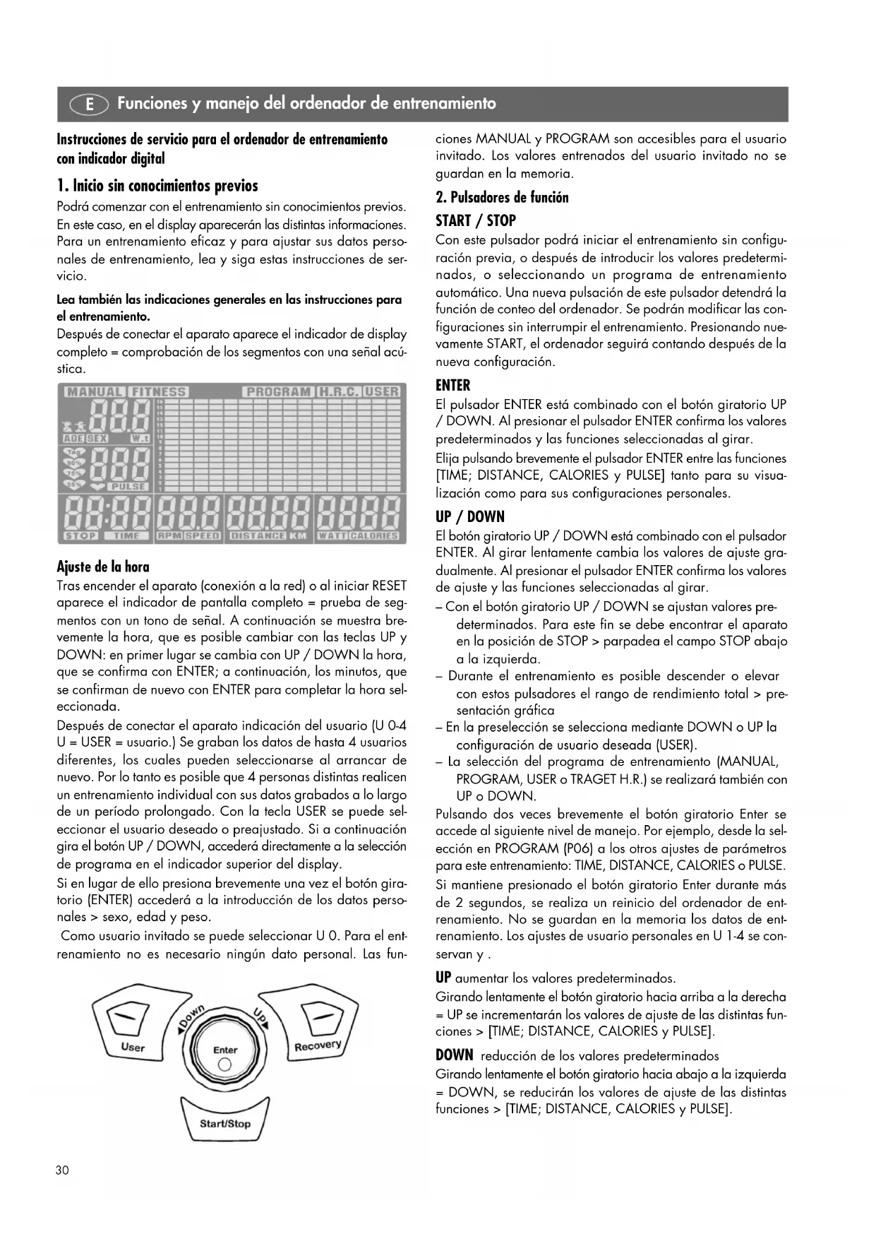 Podrá comenzar con el entrenamiento sin conocimientos previos. En este caso, en el display aparecerán las distintas informaciones. Para un entrenamiento eficaz y para ajustar sus datos perso- nales de entrenamiento, lea y siga estas instrucciones de ser- vicio. Lea también las indicaciones generales en las instrucciones para el entrenamiento. Después de conectar el aparato aparece el indicador de display completo = comprobación de los segmentos con una señal acú- stica. Ajuste de la hora Tras encender el aparato (conexión a la red) o al iniciar RESET aparece el indicador de pantalla completo = prueba de seg- mentos con un tono de señal. A continuación se muestra bre- vemente la hora, que es posible cambiar con las teclas UP y DOWN: en primer lugar se cambia con UP / DOWN la hora, que se confirma con ENTER; a continuación, los minutos, que se confirman de nuevo con ENTER para completar la hora sel- eccionada. Después de conectar el aparato indicación del usuario (U 0-4 U = USER = usuario.) Se graban los datos de hasta 4 usuarios diferentes, los cuales pueden seleccionarse al arrancar de nuevo. Por lo tanto es posible que 4 personas distintas realicen un entrenamiento individual con sus datos grabados a lo largo de un período prolongado. Con la tecla USER se puede sel- eccionar el usuario deseado o preajustado. Si a continuación gira el botón UP / DOWN, accederá directamente a la selección de programa en el indicador superior del display. Si en lugar de ello presiona brevemente una vez el botón gira- torio (ENTER) accederá a la introducción de los datos perso- nales > sexo, edad y peso. Como usuario invitado se puede seleccionar U 0. Para el ent- renamiento no es necesario ningún dato personal. Las fun- ciones MANUAL y PROGRAM son accesibles para el usuario invitado. Los valores entrenados del usuario invitado no se guardan en la memoria.