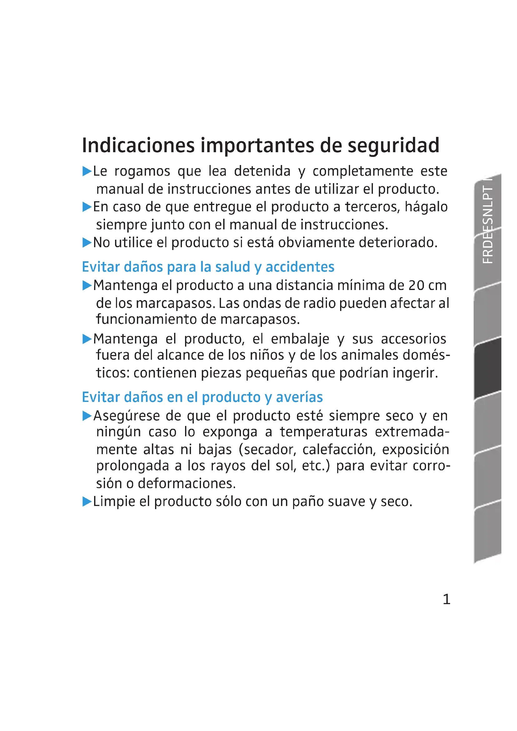 Indicaciones importantes de seguridad 왘 Le rogamos que lea detenida y completamente este manual de instrucciones antes de utilizar el producto. 왘 En caso de que entregue el producto a terceros, hágalo siempre junto con el manual de instrucciones. 왘 No utilice el producto si está obviamente deteriorado. Evitar daños para la salud y accidentes 왘 Mantenga el producto a una distancia mínima de 20 cm de los marcapasos. Las ondas de radio pueden afectar al funcionamiento de marcapasos. 왘 Mantenga el producto, el embalaje y sus accesorios fuera del alcance de los niños y de los animales domés- ticos: contienen piezas pequeñas que podrían ingerir. Evitar daños en el producto y averías 왘 Asegúrese de que el producto esté siempre seco y en ningún caso lo exponga a temperaturas extremada- mente altas ni bajas (secador, calefacción, exposición prolongada a los rayos del sol, etc.) para evitar corro- sión o deformaciones. 왘 Limpie el producto sólo con un paño suave y seco. BTD500_SP7.book Seite 1 Montag, 5. September 2011 5:16 172 왘 Utilice el producto únicamente en aquellos entornos en los que esté permitido el uso de la tecnología inalám- brica Bluetooth