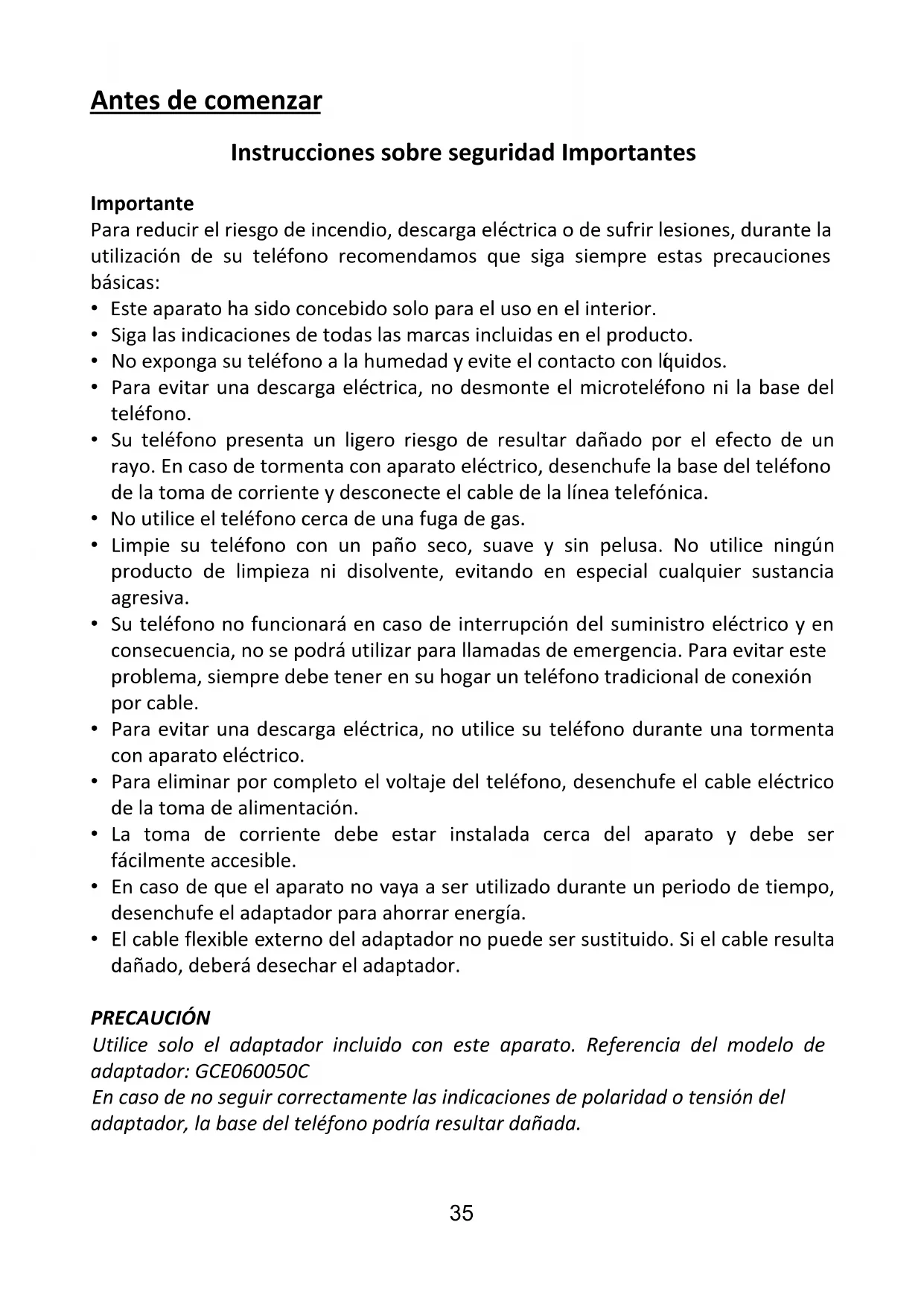 Imported by ADMEA, 12 Rue Jules Ferry, 93110 Rosny sous bois, France. THOMSON is a trademark of Technicolor SA used under license by ADMEA35 Antes de comenzar Instrucciones sobre seguridad Importantes Importante Para reducir el riesgo de incendio, descarga eléctrica o de sufrir lesiones, durante la utilización de su teléfono recomendamos que siga siempre estas precauciones básicas: