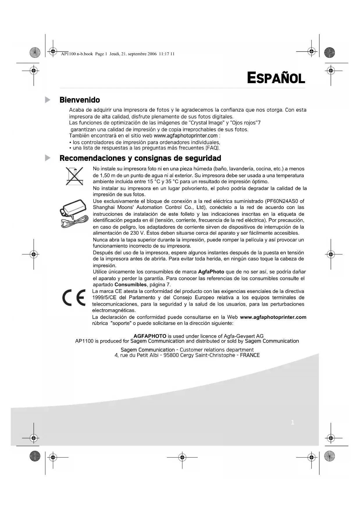 - una lista de respuestas a las preguntas más frecuentes (FAQ). Recomendaciones y consignas de seguridad No instale su impresora foto ni en una pieza húmeda (baño, lavandería, cocina, etc.) a menos de 1,50 m de un punto de agua ni al exterior. Su impresora debe ser usada a una temperatura ambiente incluida entre 15 °C y 35 °C para un resultado de impresión óptimo. No instalar su impresora en un lugar polvoriento, el polvo podría degradar la calidad de la impresión de sus fotos. Use exclusivamente el bloque de conexión a la red eléctrica suministrado (PF60N24AS0 of Shanghai Moons' Automation Control Co., Ltd), conéctelo a la red de acuerdo con las instrucciones de instalación de este folleto y las indicaciones inscritas en la etiqueta de identificación pegada en él (tensión, corriente, frecuencia de la red eléctrica). Por precaución, en caso de peligro, los adaptadores de corriente sirven de dispositivos de interrupción de la alimentación de 230 V. Éstos deben situarse cerca del aparato y ser fácilmente accesibles. Nunca abra la tapa superior durante la impresión, puede romper la película y así provocar un funcionamiento incorrecto de su impresora. Después del uso de la impresora, espere algunos instantes después de la puesta en tensión de la impresora antes de abrirla. Para evitar toda herida, en ningún caso toque la cabeza de impresión. Utilice únicamente los consumibles de marca AgfaPhoto que de no ser así, se podría dañar el aparato y perder la garantía. Para conocer las referencias de los consumibles consulte el apartado Consumibles, página 7. La marca CE atesta la conformidad del producto con las exigencias esenciales de la directiva 1999/5/CE del Parlamento y del Consejo Europeo relativa a los equipos terminales de telecomunicaciones, para la seguridad y la salud de los usuarios, para las perturbaciones electromagnéticas. La declaración de conformidad puede consultarse en la Web www.agfaphotoprinter.com rúbrica "soporte" o puede solicitarse en la dirección siguiente: AGFAPHOTO is used under licence of Agfa-Gevaert AG AP1100 is produced for Sagem Communication and distributed or sold by Sagem Communication Sagem Communication - Customer relations department 4, rue du Petit Albi - 95800 Cergy Saint-Christophe - FRANCE AP1100 n-b.book Page 1 Jeudi, 21. septembre 2006 11:17 112 Medio ambiente La conservación del medio ambiente dentro de una lógica de desarrollo sostenible es una preocupación esencial de AgfaPhoto. El Grupo AgfaPhoto tiene la voluntad de operar en sus instalaciones respetando el medio ambiente y decidió integrar el desempeño ambiental en el conjunto del ciclo de vida de sus productos, desde la fase de fabricación a la puesta en servicio, utilización y disposición final. EL EMBALAJE La presencia del logotipo (punto verde) significa que se paga una contribución a un organismo nacional autorizado, a fin de mejorar las infraestructuras de recuperación y de reciclaje de los embalajes. Para facilitar el reciclaje, por favor, respete las reglas de clasificación implementadas localmente para este tipo de desechos.