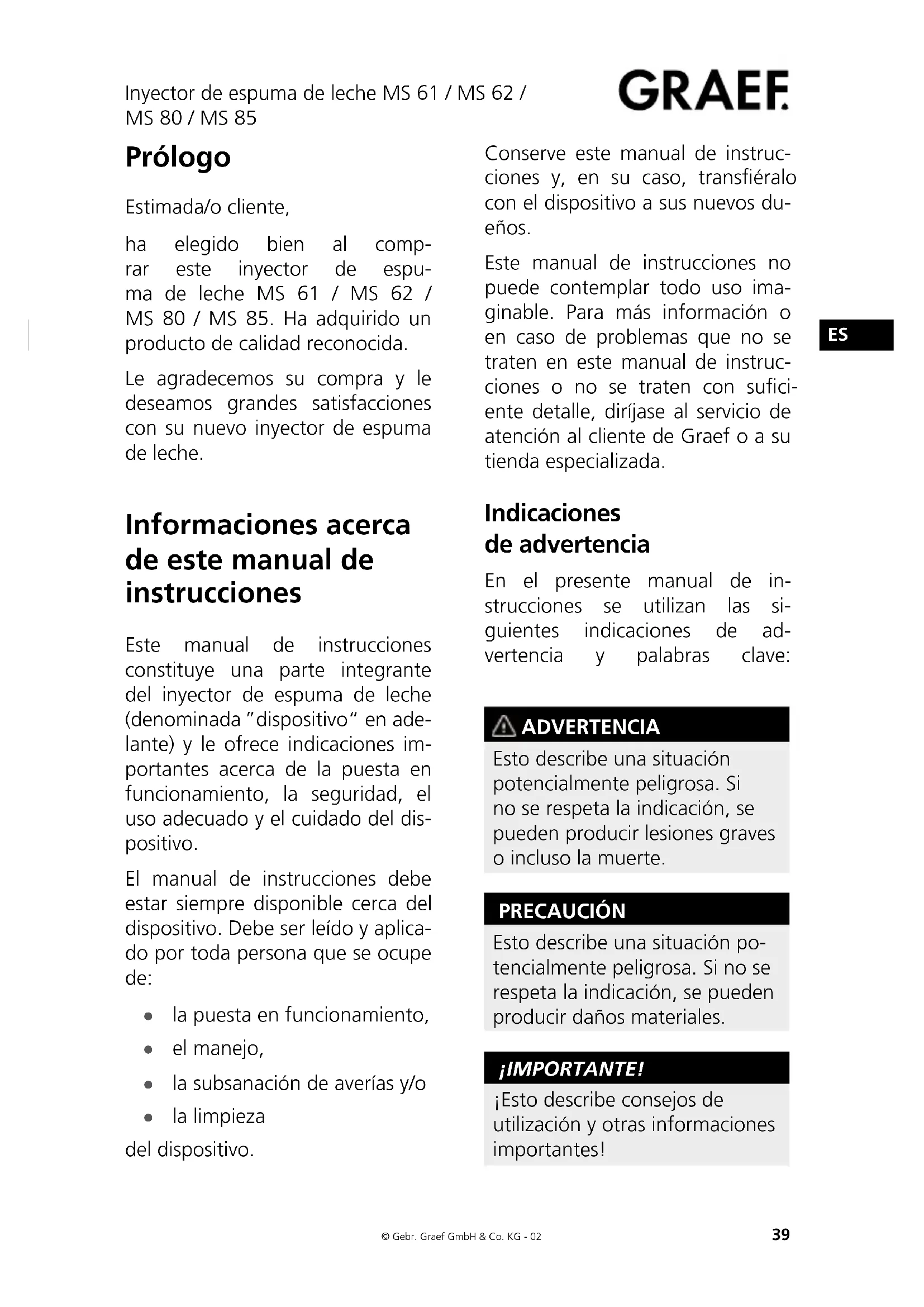 Prólogo Estimada/o cliente, ha elegido bien al comp- rar este inyector de espu- ma de leche MS 61 / MS 62 / MS 80 / MS 85. Ha adquirido un producto de calidad reconocida. Le agradecemos su compra y le deseamos grandes satisfacciones con su nuevo inyector de espuma de leche. Informaciones acerca de este manual de instrucciones Este manual de instrucciones constituye una parte integrante del inyector de espuma de leche (denominada ”dispositivo“ en ade- lante) y le ofrece indicaciones im- portantes acerca de la puesta en funcionamiento, la seguridad, el uso adecuado y el cuidado del dis- positivo. El manual de instrucciones debe estar siempre disponible cerca del dispositivo. Debe ser leído y aplica- do por toda persona que se ocupe de: ● la puesta en funcionamiento, ● el manejo, ● la subsanación de averías y/o ● la limpieza del dispositivo. Conserve este manual de instruc- ciones y, en su caso, transéralo con el dispositivo a sus nuevos du- eños. Este manual de instrucciones no puede contemplar todo uso ima- ginable. Para más información o en caso de problemas que no se traten en este manual de instruc- ciones o no se traten con suci- ente detalle, diríjase al servicio de atención al cliente de Graef o a su tienda especializada. Indicaciones de advertencia En el presente manual de in- strucciones se utilizan las si- guientes indicaciones de ad- vertencia y palabras clave: ADVERTENCIA Esto describe una situación potencialmente peligrosa. Si no se respeta la indicación, se pueden producir lesiones graves o incluso la muerte. PRECAUCIÓN Esto describe una situación po- tencialmente peligrosa. Si no se respeta la indicación, se pueden producir daños materiales. ¡importante! ¡Esto describe consejos de utilización y otras informaciones importantes!Inyector de espuma de leche MS 61 / MS 62 / MS 80 / MS 85