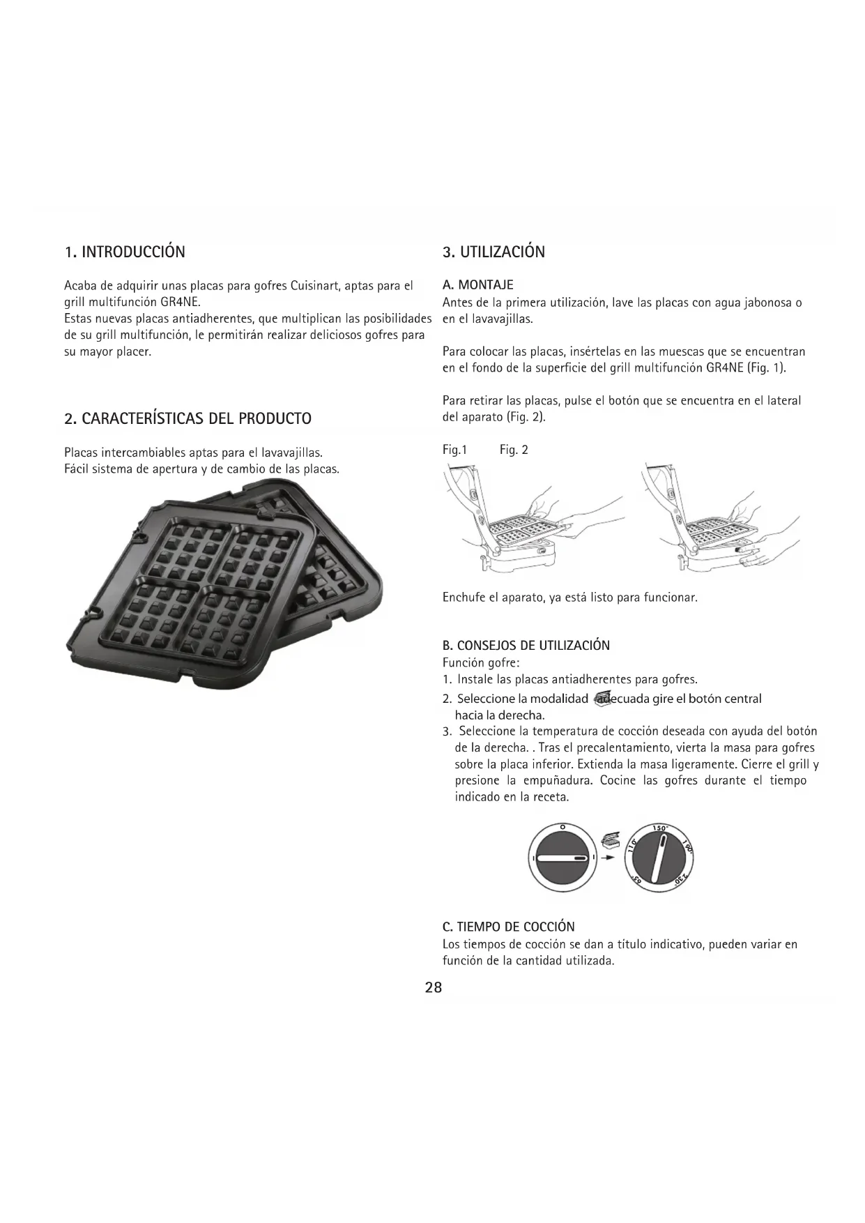 A. MONTAJE Antesdelaprimerautilización,lavelasplacasconaguajabonosao enellavavajillas. Para colocar las placas, insértelas en las muescas que se encuentran en el fondo de la superficie del grill multifunción GR4NE (Fig. 1). Para retirar las placas, pulse el botón que se encuentra en el lateral del aparato (Fig. 2). Fig.1 Fig. 2 Enchufe el aparato, ya está listo para funcionar.