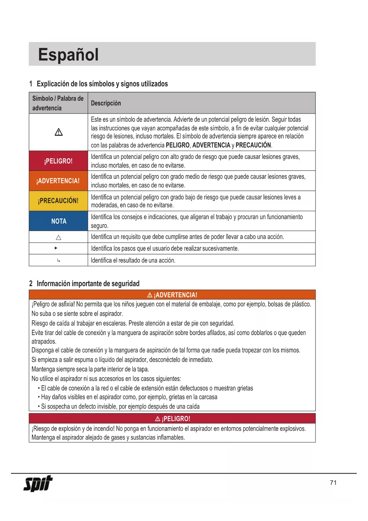 - en el ventilador ** en la manguera Potencia máx. de los aspiradores con enchufe: 2000 W Cable de conexión a la red en aspiradores con enchufe: H07RN-F 3G1,580 16 Pruebas y aprobaciones Deben realizarse las comprobaciones electrotécnicas conforme a la normativa y a la norma de prevención de accidentes (DGUV V3), así como DIN VDE 0701 parte 1 y parte 3. Dichas comprobaciones son necesarias conforme a DIN VDE 0702 a intervalos regulares y después de cada reparación o modicación. Los aspiradores han sido sometidos a prueba con éxito conforme a IEC/EN 60335–2–69. NOTA Los aparatos usados contienen materiales valiosos, adecuados para el reciclaje. No elimine el aspirador junto con la basura doméstica normal, en su lugar, elimínelo a través de los sistema adecuados de recogida de residuos, p. ej. a través de su punto municipal de recogida de residuos. 17 Declaración de conformidad Por la presente declaramos que la máquina descrita a continuación cumple los requisitos relevantes de seguridad y salud básicos de las directivas CE, tanto en su diseño básico y construcción como en la versión puesta por nosotros en circulación. La presente declaración perderá su validez en caso de que se realicen modicaciones en la máquina sin nuestro consentimiento explícito. Producto: Aspirador para funcionamiento en húmedo y en seco Tipo: ISP modelo AC 1630 P El diseño del aparato corresponde a las siguientes normas pertinentes: Directiva de Máquinas de la CE 2006/42/UE Directiva EMC de la CE 2014/30/CE ROHS 2011/65/UE Directiva de Máquinas de la CE 2006/42/UE incluidas sus enmiendas: DIN EN 60335-1 (VDE 0700-1):2012-10; EN 60335-1:2012 DIN EN 60335-1 Ber.1 (VDE 700-1 Ber.1):2014-04; EN 60335-1:2012/AC:2014; EN 60335-1:2012/A11:2014 EN 60335-2-69:2012; DIN EN 62233 (VDE 0700-366 Ber.1):2009-04; EN 62233 Ber.1:2008; DIN EN ISO 12100:2011-03; EN ISO 12100:2010 Directiva EMC de la CE 2014/30/CE: DIN EN 55014-1 (VDE 0875-14-1):2012-05; EN 55014-1:2006 + A1:2009 + A2:2011 DIN EN 61000-3-2 (VDE 0838-2):2015-03; EN 61000-3-2:2014; DIN EN 61000-3-3 (VDE 0838-3):2014-03; EN 61000-3-3:2013; DIN EN 55014-2 (VDE 0875-14-2):2009; EN 55014-2:1997 + A1:2001 + A2:2008 Requisitos de la categoría II El siguiente instituto ha probado y certicado el producto: VDE Prüf- und Zertizierungsinstitut GmbH (EU-Kenn-Nr. 03666), Merianstr. 28, 63069 Offenbach Representante autorizado de documentación: Spit S.A.S., 150 Avenue de Lyon, B.P.104,