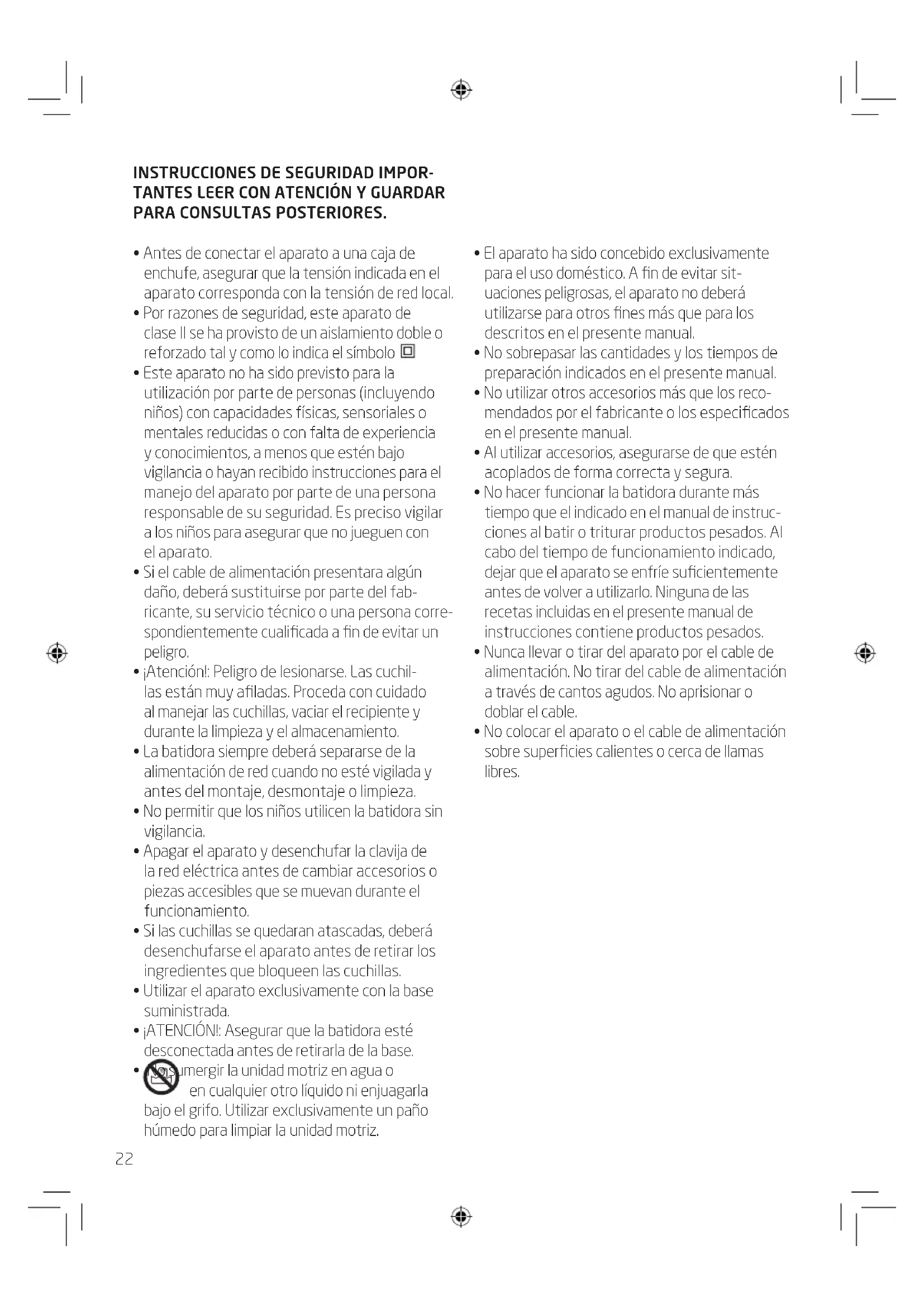 - No hacer funciona la batidora durante más tiempo que el indicado en el manual de instrucciones al batir o triturar productos pesados. Al cabo del tiempo de funciona bajo indicado,deojar que el aparato se enfierte suficientemente antes de volver a utiliser. Ninguna de las recetas incluidas en el presentemanual de instrucciones contiene productos pesados.