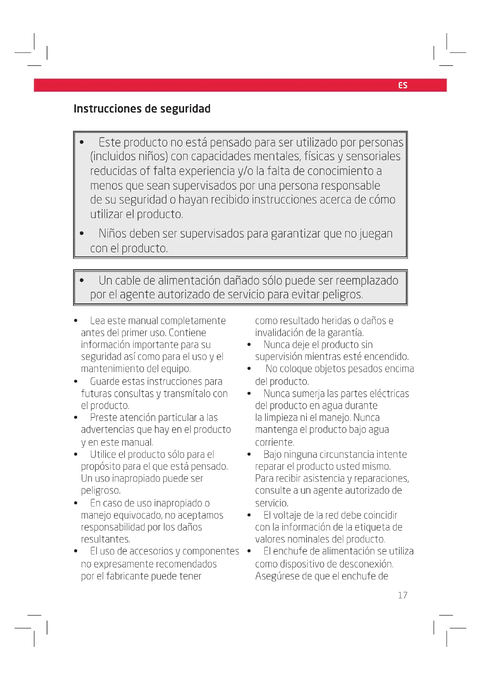 - Este producto no está pensado para ser utilisé por personas (incluidos niños) con capacities mentales, fibras y sensoriales reduidas ofalta experiencia y/o la falta de conocimiento a menos que Sean supervisados por una persona responsable de su seguridad o hayan recibido instrucciones acerca de como utiliser el producto.