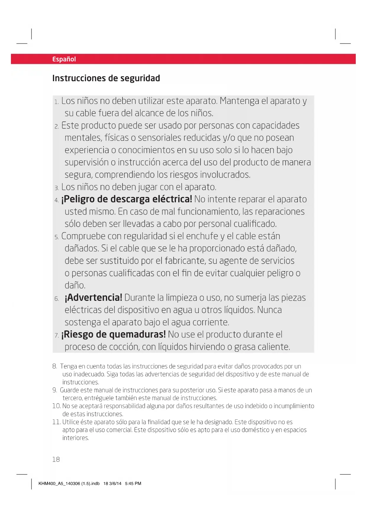 apto para el uso comercial. Este dispositivo sólo es apto para el uso doméstico y en espacios interiores. KHM400_A5_140306 (1.5).indb 18 3/6/14 5:45 PM19 Español Instrucciones de seguridad