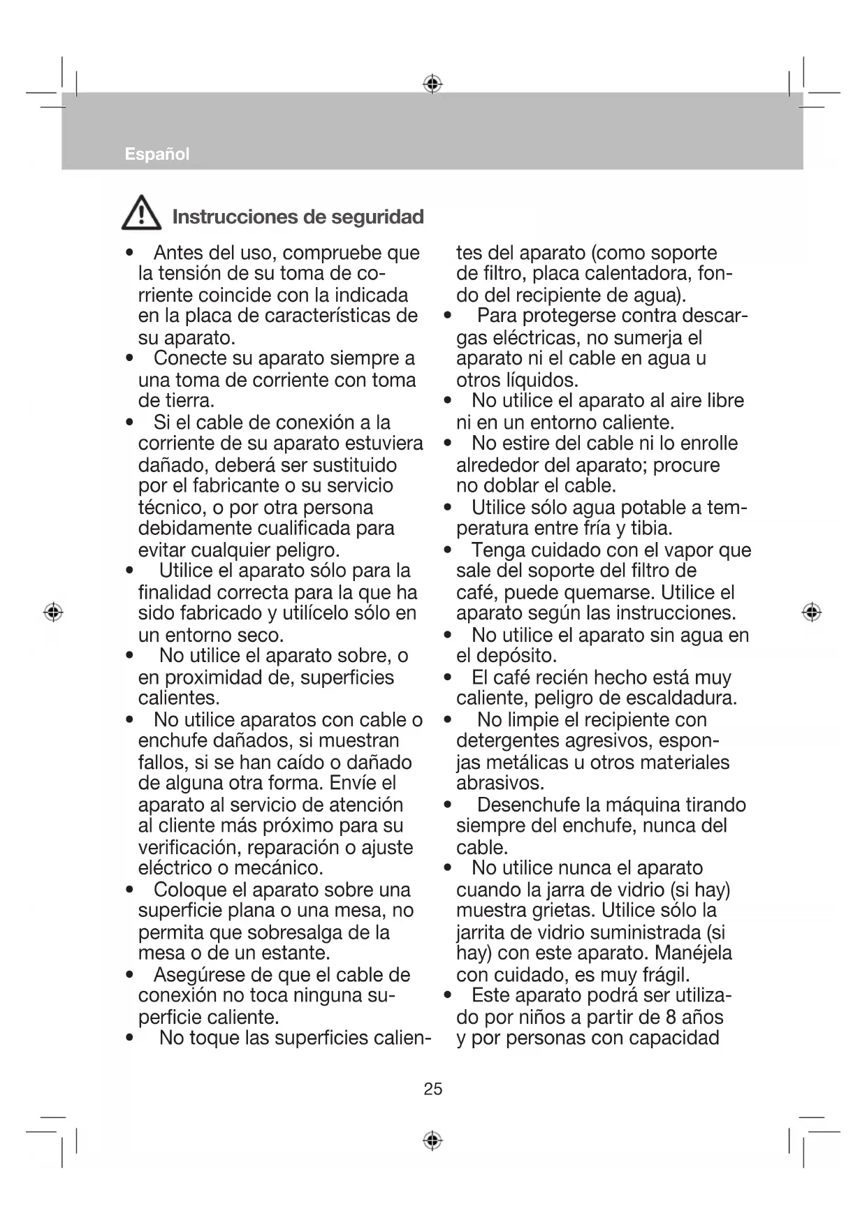 - No permita el acceso a esta máquina ni a su cable a niños menores de 8 años.27 Español Finalidad de uso Este aparato está diseñado exclusiva- mente para preparar café. El aparato ha sido diseñado para uso doméstico o en entornos similares no comercia- les como tiendas, oficinas o entornos laborales similares, en instalaciones agropecuarias, por clientes de hoteles, moteles y otras instalaciones residen- ciales, o en pensiones. Use el aparato según las instrucciones indicadas. Un uso inadecuado puede suponer un riesgo y anulará cualquier reclamación por garantía. Siga las instrucciones de seguridad. Estimado cliente Le damos la enhorabuena por la adqui-sición de Café-BoXX. Lea atentamente todas las instrucciones antes de usar el aparato y consérvelas para su uso en el futuro. Índice Instrucciones de seguridad 25 Símbolos utilizados 27 Finalidad de uso 27 Contenido de la entrega 28 Antes del primer uso 28 Funcionamiento 29 Limpieza y cuidados 31 Descalcificación 31 Datos técnicos 31 Garantía 32 Limitación de responsabilidad 32 Declaración de cumplimiento 32 Eliminación 32 Símbolos utilizados Indica una situación peligrosa que puede provocar daños personales o materiales. Nota: Si se ha pulsado el botón de encen- dido (7) antes de enchufar la cafete- ra, ésta estará encendida cuando se conecte el cable de alimentación a una toma de corriente. Si el depósito de agua ya contie- ne agua, el aparato comenzará la preparación. Si el depósito de agua está vacío, el aparato se apagará automáticamente pasados unos segundos. El testigo (8) se apagará.28 Español