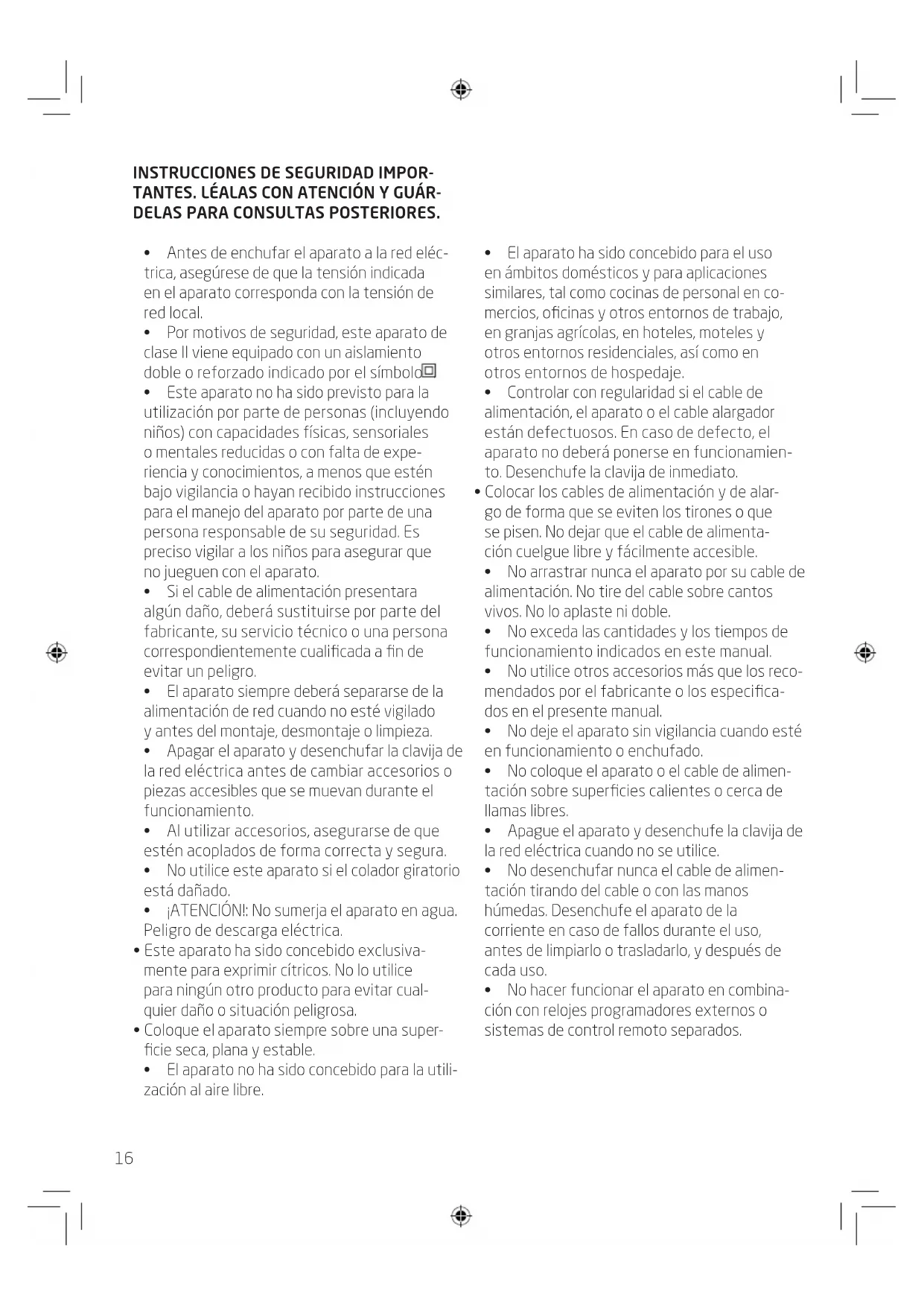 - Este aparato ha sido concebido exclusiva- mente para exprimir cítricos. No lo utilice para ningún otro producto para evitar cual- quier daño o situación peligrosa.